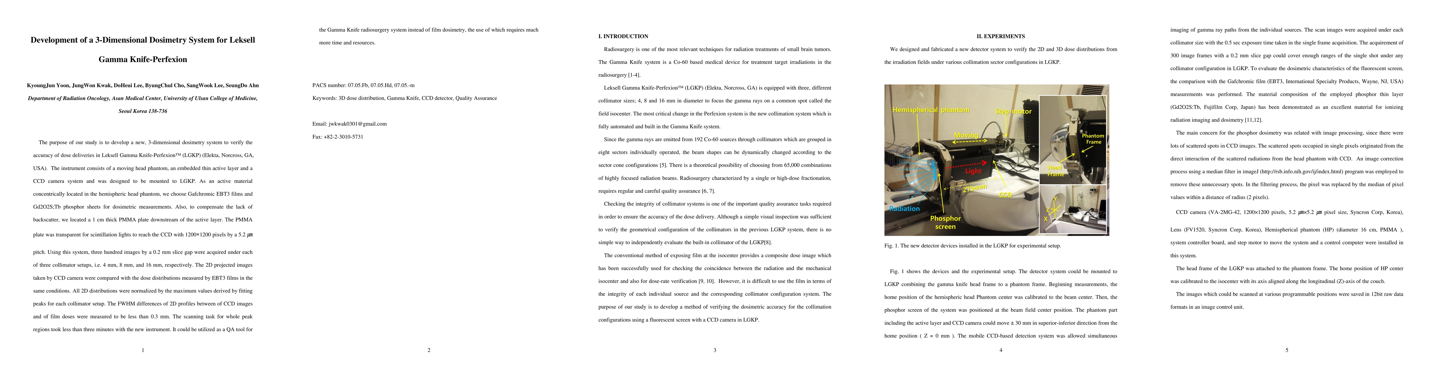 This study developed a 3-dimensional dosimetry system for verifying the accuracy of dose deliveries in Leksell Gamma Knife-Perfexion, utilizing Gafchromic EBT3 films and phosphor sheets, and a CCD camera system. The new system showed high accuracy with FWHM differences less than 0.3 mm and can serve as a more efficient QA tool compared to traditional film dosimetry.