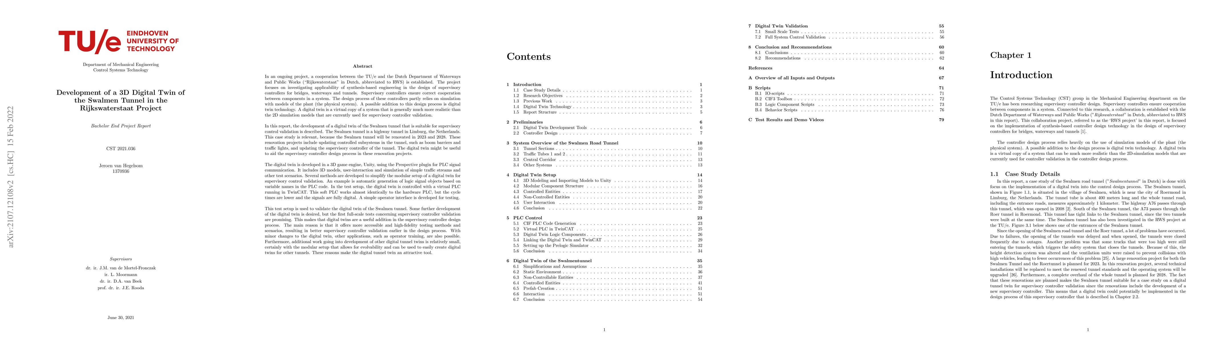 In an ongoing project, a cooperation between the TU/e and the Dutch Department of Waterways and Public Works (Rijkswaterstaat in Dutch, abbreviated to RWS) is established. The project focuses on investigating applicability of synthesis-based engineering in the design of supervisory controllers for bridges, waterways and tunnels. Supervisory controllers ensure correct cooperation between components in a system. The design process of these controllers partly relies on simulation with models of the plant (the physical system). A possible addition to this design process is digital twin technology. A digital twin is a virtual copy of a system that is generally much more realistic than the 2D simulation models that are currently used for supervisory controller validation. In this report, the development of a digital twin of the Swalmen tunnel that is suitable for supervisory control validation is described. The Swalmen tunnel is a highway tunnel in Limburg, the Netherlands. This case study is relevant, because the Swalmen tunnel will be renovated in 2023 and 2028. These renovation projects include updating controlled subsystems in the tunnel, such as boom barriers and traffic lights, and updating the supervisory controller of the tunnel. The digital twin might be useful to aid the supervisory controller design process in these renovation projects.
