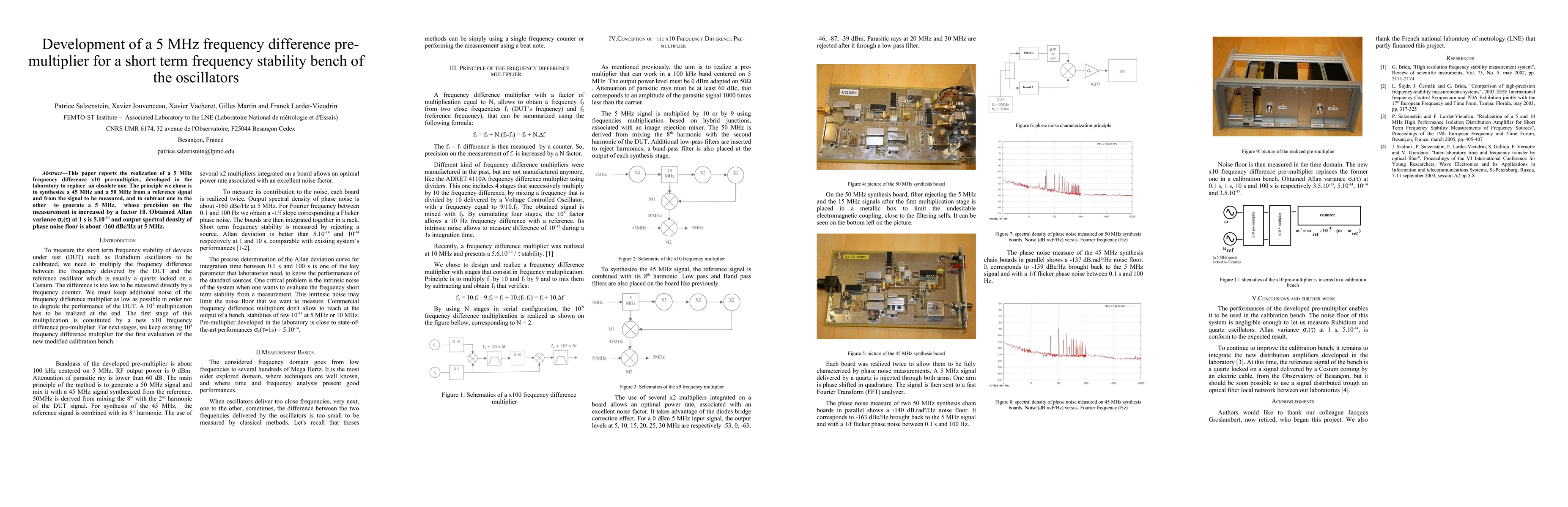This paper reports the realization of a 5 MHz frequency difference x10 pre-multiplier, developed in the laboratory to replace an obsolete one. The principle we chose is to synthesize a 45 MHz and a 50 MHz from a reference signal and from the signal to be measured, and to subtract one to the other to generate a 5 MHz, whose precision on the measurement is increased by a factor 10. Obtained Allan variance y() at 1 s is 5.10-14 and output spectral density of phase noise floor is about -160 dBc/Hz at 5 MHz.