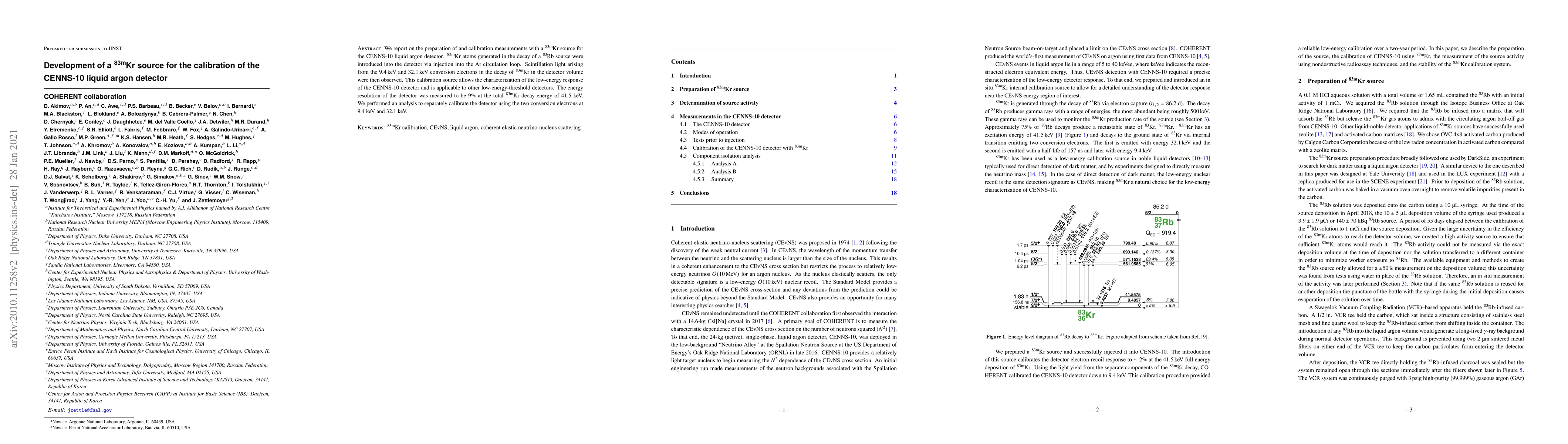 Researchers created a $^{83 ext{m}}$Kr source for calibrating the CENNS-10 liquid argon detector, enabling the characterization of low-energy responses and achieving an energy resolution of 9% at 41.5 keV.