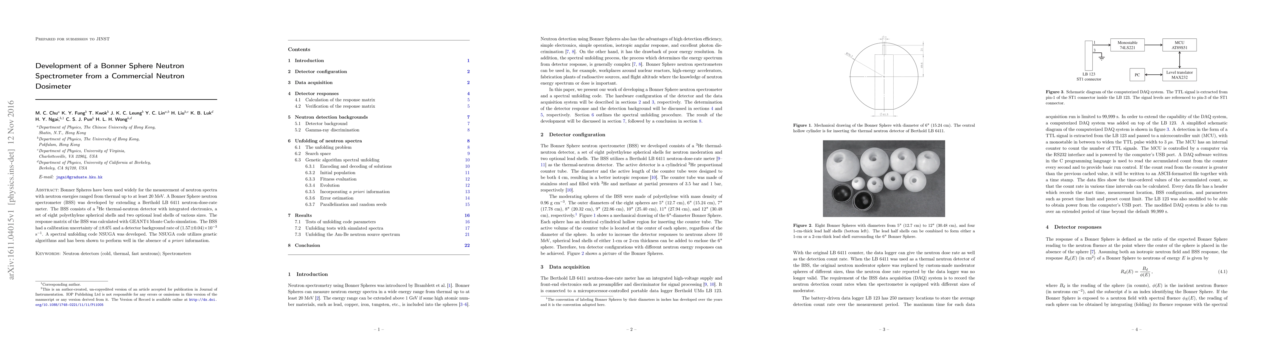 Bonner Spheres have been used widely for the measurement of neutron spectra with neutron energies ranged from thermal up to at least 20 MeV. A Bonner Sphere neutron spectrometer (BSS) was developed by extending a Berthold LB 6411 neutron-dose-rate meter. The BSS consists of a $^{3}$He thermal-neutron detector with integrated electronics, a set of eight polyethylene spherical shells and two optional lead shells of various sizes. The response matrix of the BSS was calculated with GEANT4 Monte Carlo simulation. The BSS had a calibration uncertainty of $\pm 8.6\%$ and a detector background rate of $(1.57 \pm 0.04) \times 10^{-3}$ s$^{-1}$. A spectral unfolding code NSUGA was developed. The NSUGA code utilizes genetic algorithms and has been shown to perform well in the absence of a priori information.