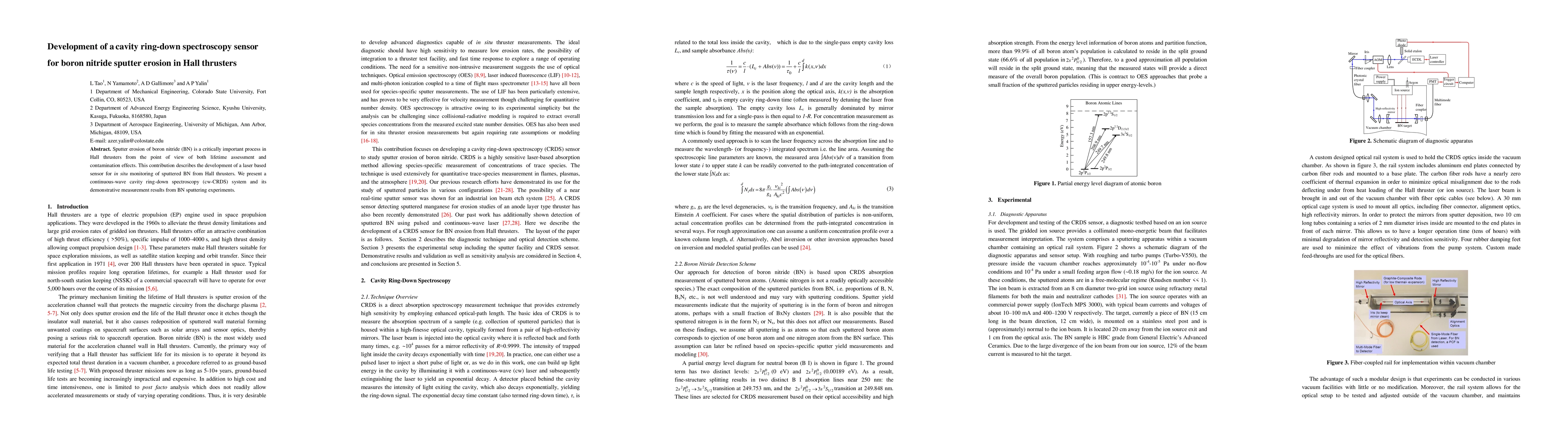 Sputter erosion of boron nitride (BN) is a critically important process in Hall thrusters from the point of view of both lifetime assessment and contamination effects. This contribution describes the development of a laser based sensor for in situ monitoring of sputtered BN from Hall thrusters. We present a continuous-wave cavity ring-down spectroscopy (cw-CRDS) system and its demonstrative measurement results from BN sputtering experiments.