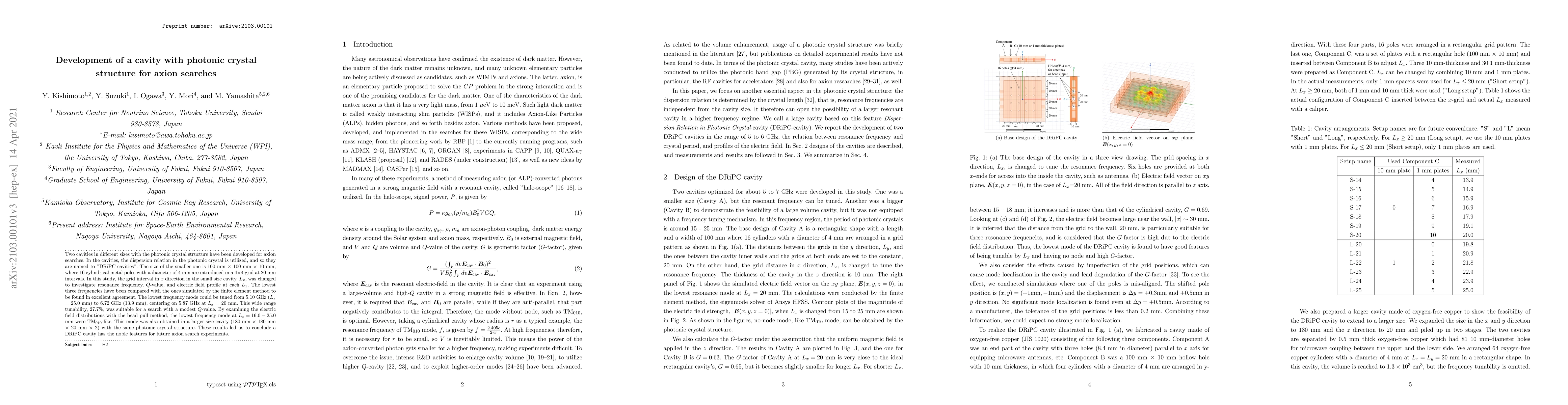 Two cavities in different size with the photonic crystal structure have been developed for axion searches. In the cavities, the dispersion relation in the photonic crystal is utilised, and so was named to "DRiPC cavities". The size of the smaller one is 100 mm x 100 mm x 10 mm, where 16 cylindrical metal poles with a diameter of 4 mm are introduced in a 4x4 grid at 20 mm intervals. In this study, the grid interval in x direction in the small size cavity, Lx, was changed to investigate resonance frequency, Q-value, and electric field profile at each Lx. The lowest three frequencies have been compared with the ones simulated by the finite element method to be found in excellent agreement. The lowest frequency mode could be tuned from 5.10 GHz (Lx = 25.0 mm) to 6.72 GHz (13.9 mm), centering on 5.87 GHz at Lx = 20 mm. This wide range tunability, 27.7%, was suitable for a search with a modest Q-value. By examining the electric field distributions with the bead pull method, the lowest frequency mode at Lx = 16.0 - 25.0 mm were TM010-like. This mode was also obtained in a larger size cavity (180 mm x 180 mm x 20 mm x 2) with the same photonic crystal structure. These results led us to conclude a DRiPC cavity has the noble features for future axion search experiments.