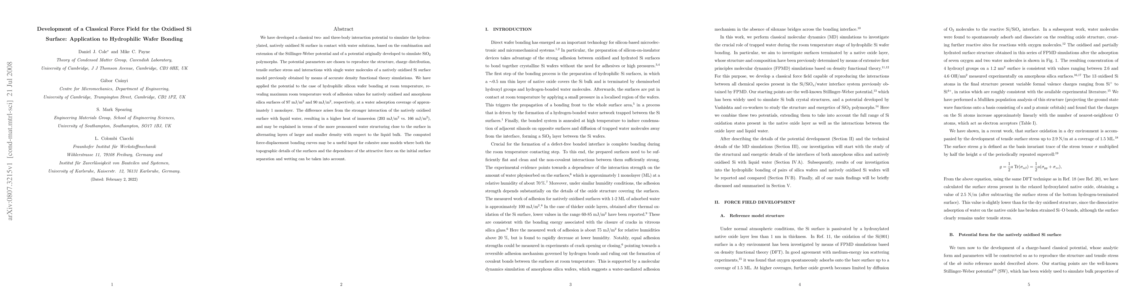 We have developed a classical two- and three-body interaction potential to simulate the hydroxylated, natively oxidised Si surface in contact with water solutions, based on the combination and extension of the Stillinger-Weber potential and of a potential originally developed to simulate SiO2 polymorphs. The potential parameters are chosen to reproduce the structure, charge distribution, tensile surface stress and interactions with single water molecules of a natively oxidised Si surface model previously obtained by means of accurate density functional theory simulations. We have applied the potential to the case of hydrophilic silicon wafer bonding at room temperature, revealing maximum room temperature work of adhesion values for natively oxidised and amorphous silica surfaces of 97 mJ/m2 and 90mJ/m2, respectively, at a water adsorption coverage of approximately 1 monolayer. The difference arises from the stronger interaction of the natively oxidised surface with liquid water, resulting in a higher heat of immersion (203 mJ/m2 vs. 166 mJ/m2), and may be explained in terms of the more pronounced water structuring close to the surface in alternating layers of larger and smaller density with respect to the liquid bulk. The computed force-displacement bonding curves may be a useful input for cohesive zone models where both the topographic details of the surfaces and the dependence of the attractive force on the initial surface separation and wetting can be taken into account.