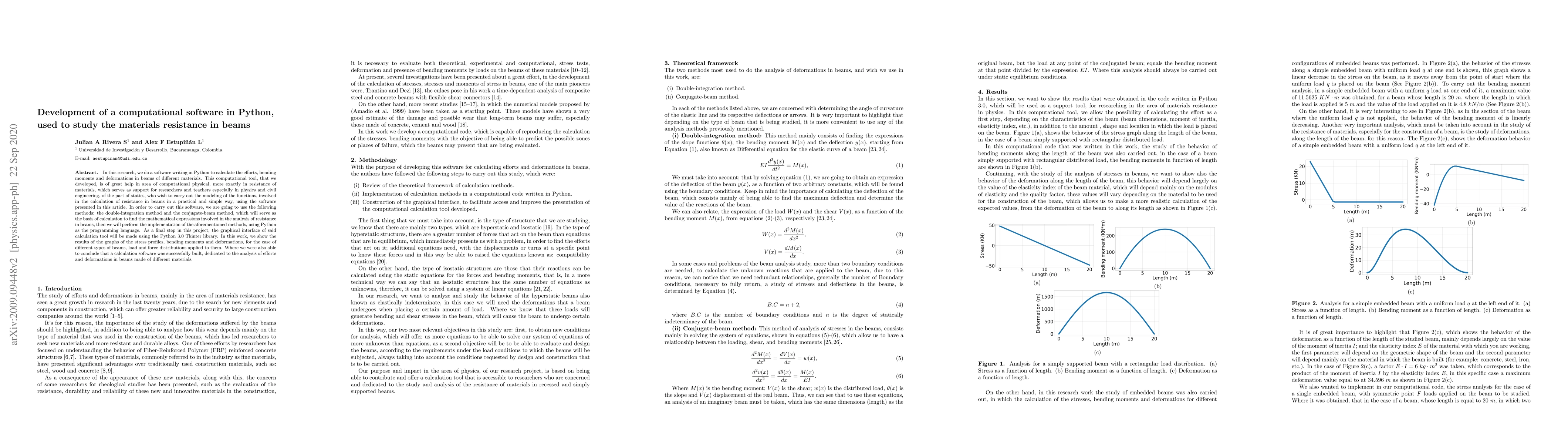 This paper presents a Python-based computational tool for analyzing stress, bending moments, and deformations in beams made of various materials. Utilizing the double-integration and conjugate-beam methods, the software offers practical modeling for researchers and educators in physics and civil engineering. The tool's graphical interface, built with Python 3.0 Tkinter, displays graphs of stress profiles, bending moments, and deformations for diverse beam types, loads, and force distributions, demonstrating successful creation of a specialized calculation software for beam resistance analysis.