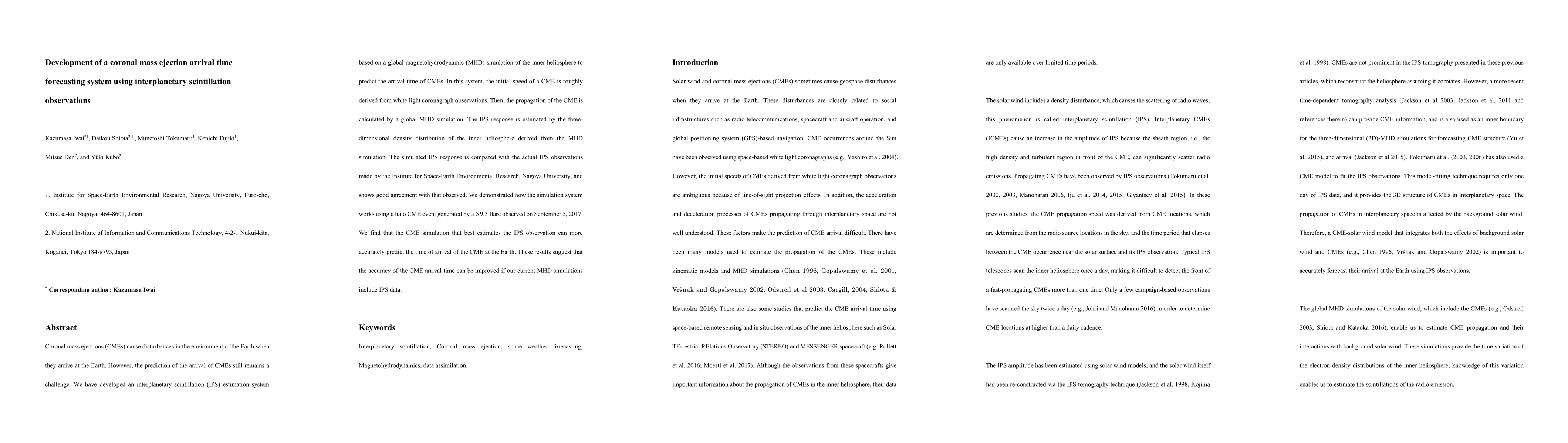 This paper develops a forecasting system for coronal mass ejection (CME) arrival times using interplanetary scintillation (IPS) observations and global magnetohydrodynamic (MHD) simulations. The system estimates CME speeds and propagation, showing good agreement with actual IPS observations, and suggests improved CME arrival time predictions when IPS data is incorporated into MHD simulations.