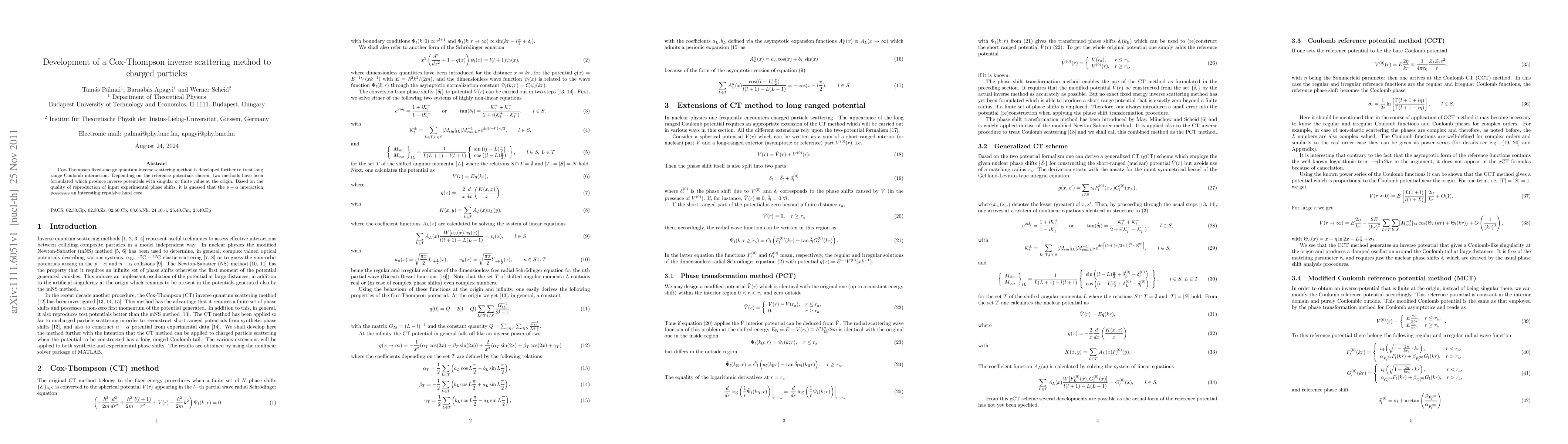 Summary: This paper develops a Cox-Thompson inverse scattering method for charged particles, focusing on long-range Coulomb interactions. Two methods are formulated, producing inverse potentials with different behaviors at the origin, and suggest the presence of a repulsive hard core in the p-alpha interaction based on phase shift reproduction.