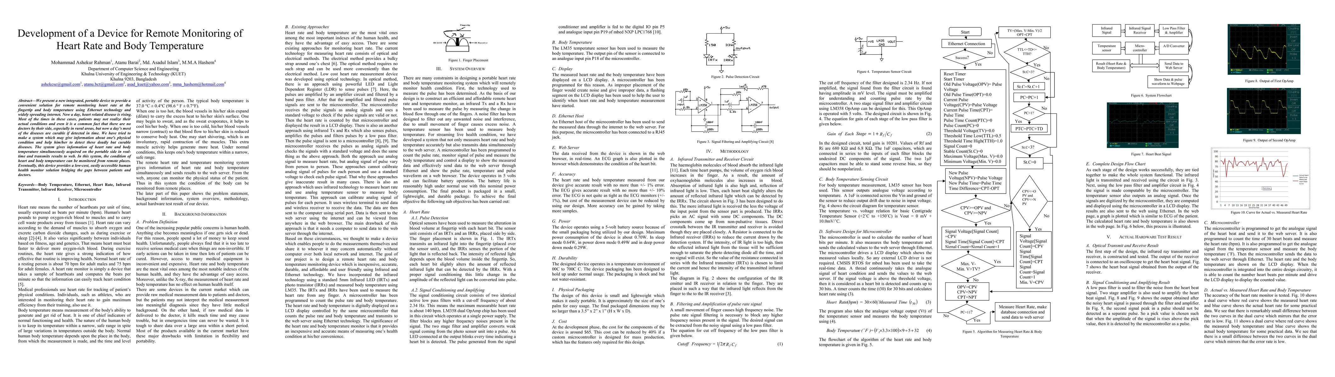 This paper introduces a portable, integrated device for remote monitoring of heart rate and body temperature via Ethernet and internet, aiming to provide timely health information and bridge healthcare gaps in rural areas, especially for curable heart-related diseases. The device transmits real-time data to a web platform for remote monitoring.