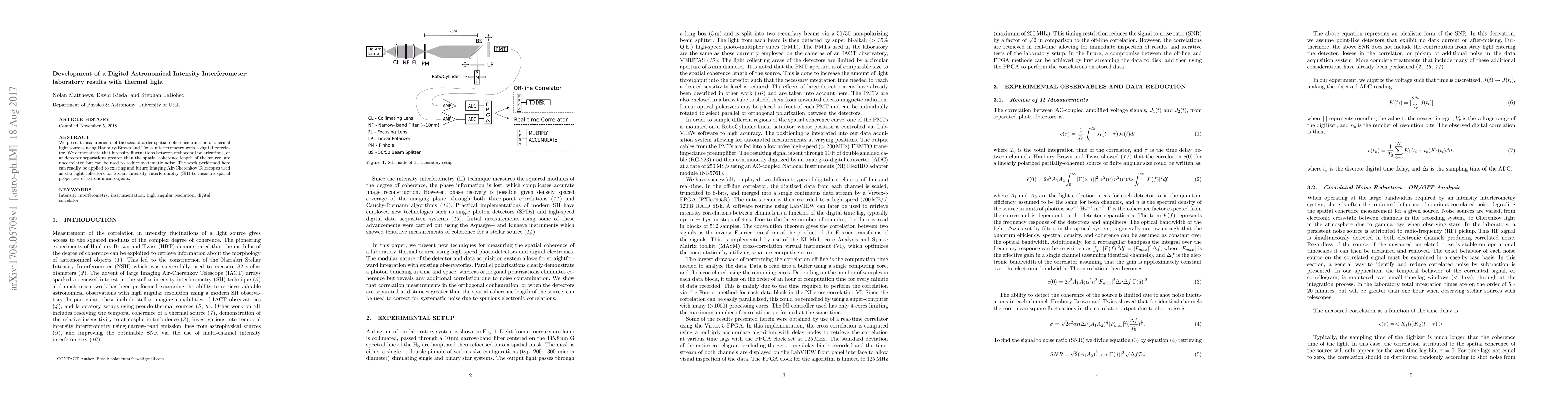 We present measurements of the second order spatial coherence function of thermal light sources using Hanbury-Brown and Twiss interferometry with a digital correlator. We demonstrate that intensity fluctuations between orthogonal polarizations, or at detector separations greater than the spatial coherence length of the source, are uncorrelated but can be used to reduce systematic noise. The work performed here can readily be applied to existing and future Imaging Air-Cherenkov Telescopes used as star light collectors for Stellar Intensity Interferometry (SII) to measure spatial properties of astronomical objects.