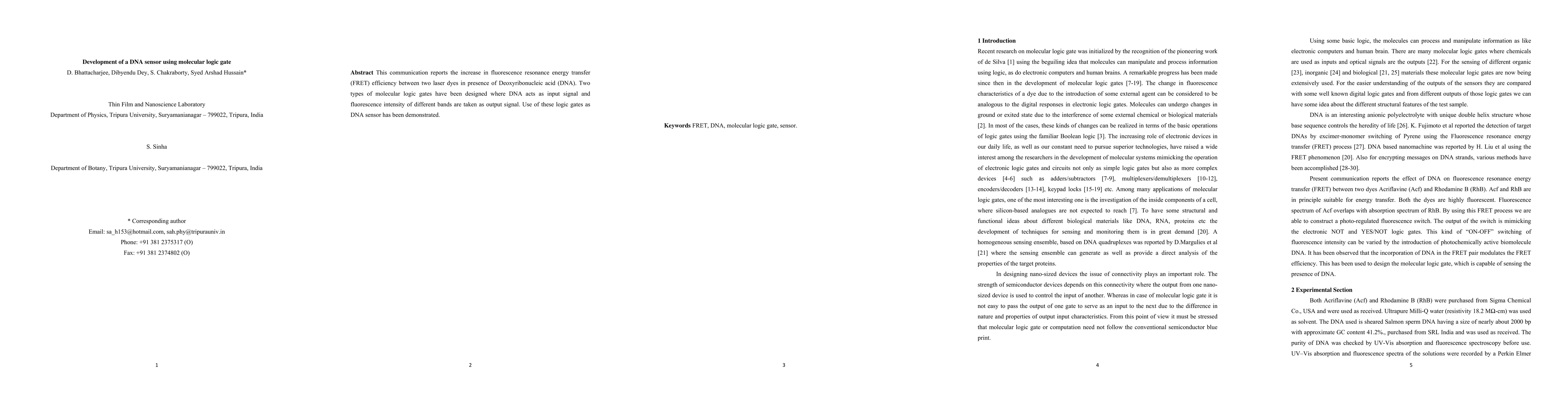The paper presents a DNA sensor utilizing molecular logic gates with increased fluorescence resonance energy transfer (FRET) efficiency between laser dyes, where DNA acts as input and fluorescence intensity serves as output. The effectiveness of these logic gates in detecting DNA is demonstrated.
