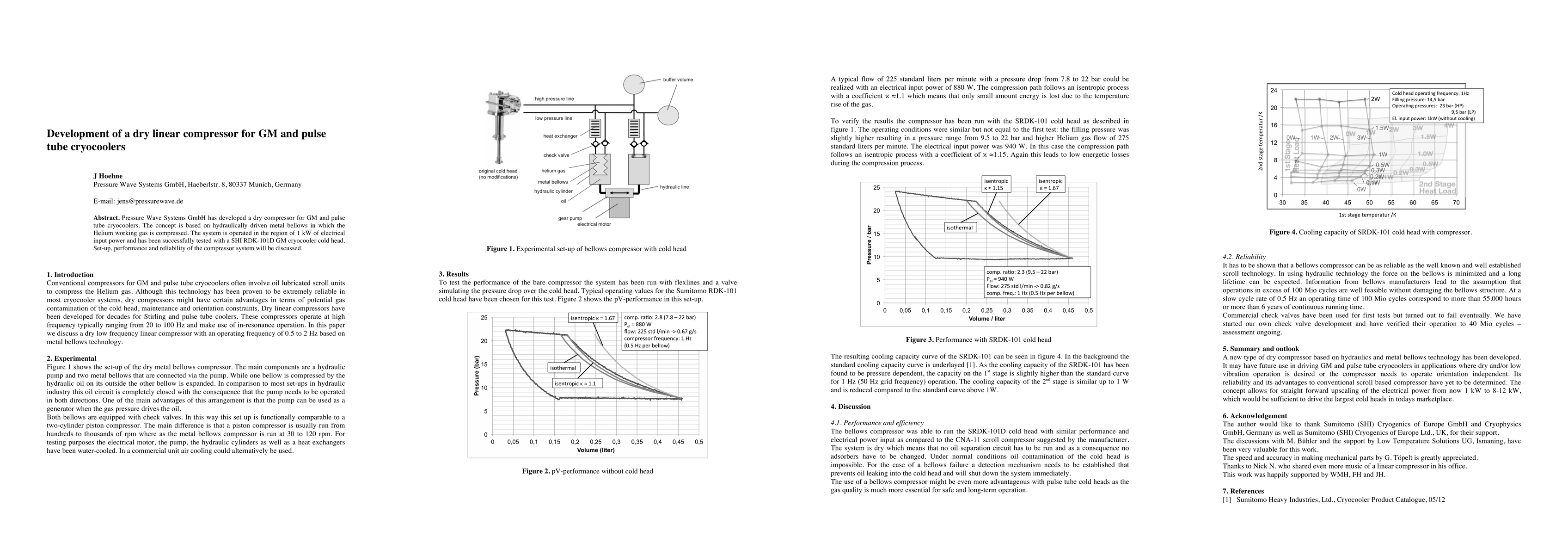 Pressure Wave Systems GmbH has developed a dry compressor for GM and pulse tube cryocoolers. The concept is based on hydraulically driven metal bellows in which the Helium working gas is compressed. The system is operated in the region of 1 kW of electrical input power and has been successfully tested with a SHI RDK-101D GM cryocooler cold head. Set-up, performance and reliability of the compressor system will be discussed.