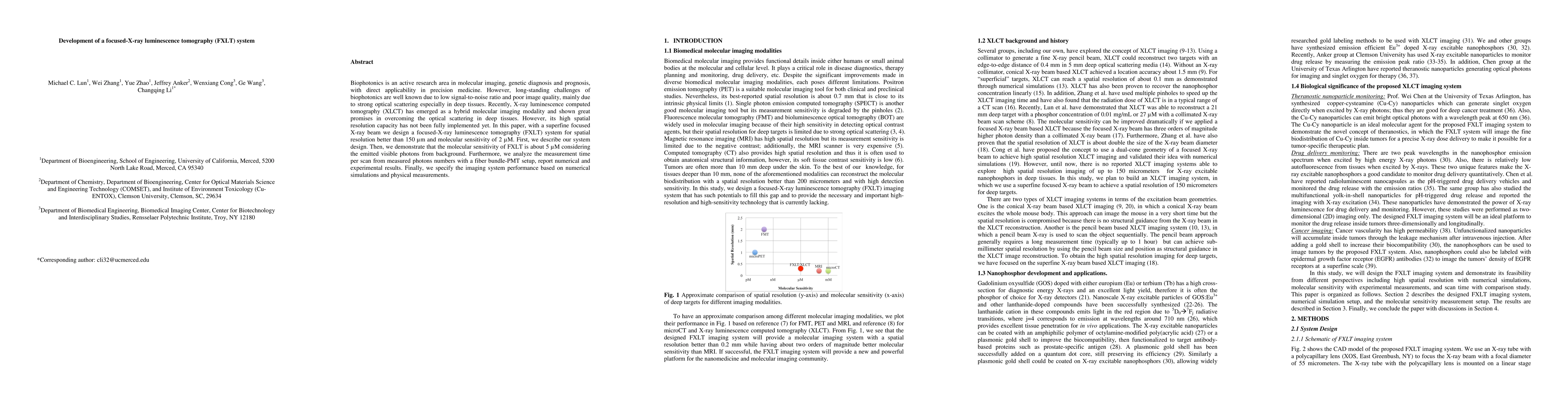 The research describes the design of a focused-X-ray luminescence tomography (FXLT) system utilizing a superfine X-ray beam for high spatial resolution and molecular sensitivity. The system incorporates a high-power X-ray tube with a polycapillary focusing lens, 4 photosensor modules with PMTs for photon detection, and a temperature control system to maintain optimal conditions for mouse imaging.