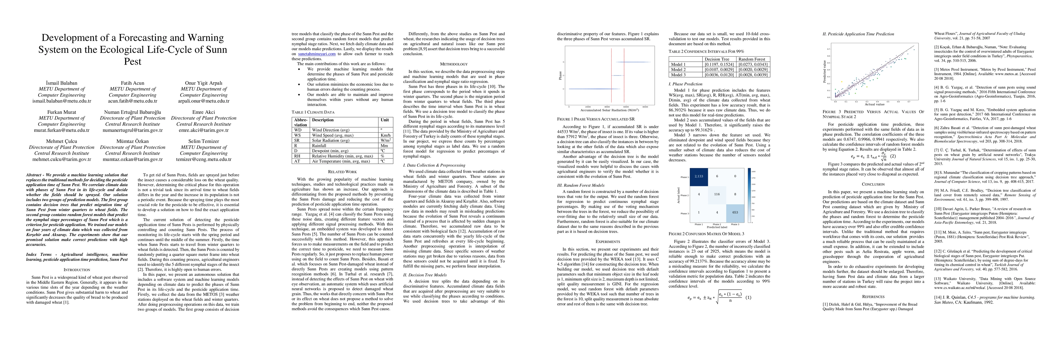 We provide a machine learning solution that replaces the traditional methods for deciding the pesticide application time of Sunn Pest. We correlate climate data with phases of Sunn Pest in its life-cycle and decide whether the fields should be sprayed. Our solution includes two groups of prediction models. The first group contains decision trees that predict migration time of Sunn Pest from winter quarters to wheat fields. The second group contains random forest models that predict the nymphal stage percentages of Sunn Pest which is a criterion for pesticide application. We trained our models on four years of climate data which was collected from Kir\c{s}ehir and Aksaray. The experiments show that our promised solution make correct predictions with high accuracies.
