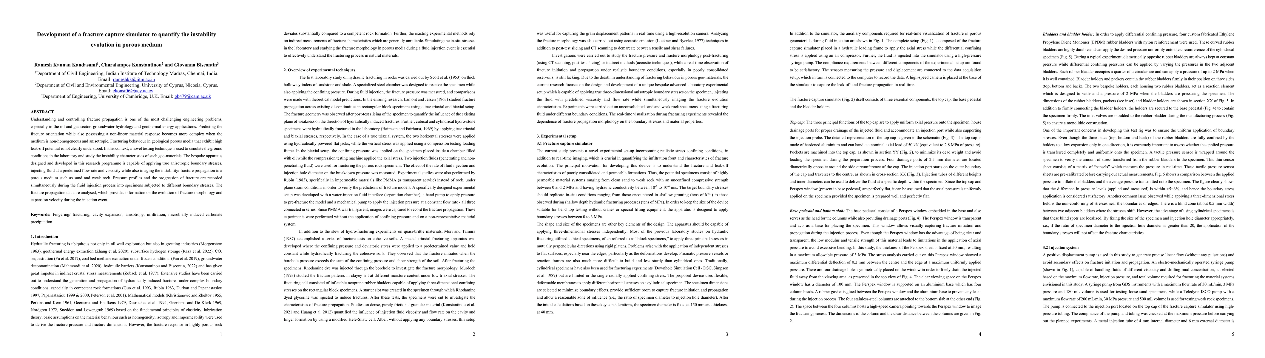Understanding and controlling fracture propagation is one of the most challenging engineering problems, especially in the oil and gas sector, groundwater hydrology and geothermal energy applications. Predicting the fracture orientation while also possessing a non-linear material response becomes more complex when the medium is non-homogeneous and anisotropic. Fracturing behaviour in geological porous media that exhibit high leak-off potential is not clearly understood. In this context, a novel testing technique is used to simulate the ground conditions in the laboratory and study the instability characteristics of such geo-materials. The bespoke apparatus designed and developed in this research programme is capable of applying true anisotropic boundary stresses, injecting fluid at a predefined flow rate and viscosity while also imaging the instability/ fracture propagation in a porous medium such as sand and weak rock. Pressure profiles and the progression of fracture are recorded simultaneously during the fluid injection process into specimens subjected to different boundary stresses. The fracture propagation data are analysed, which provides information on the evolution of fracture morphology and expansion velocity during the injection event.