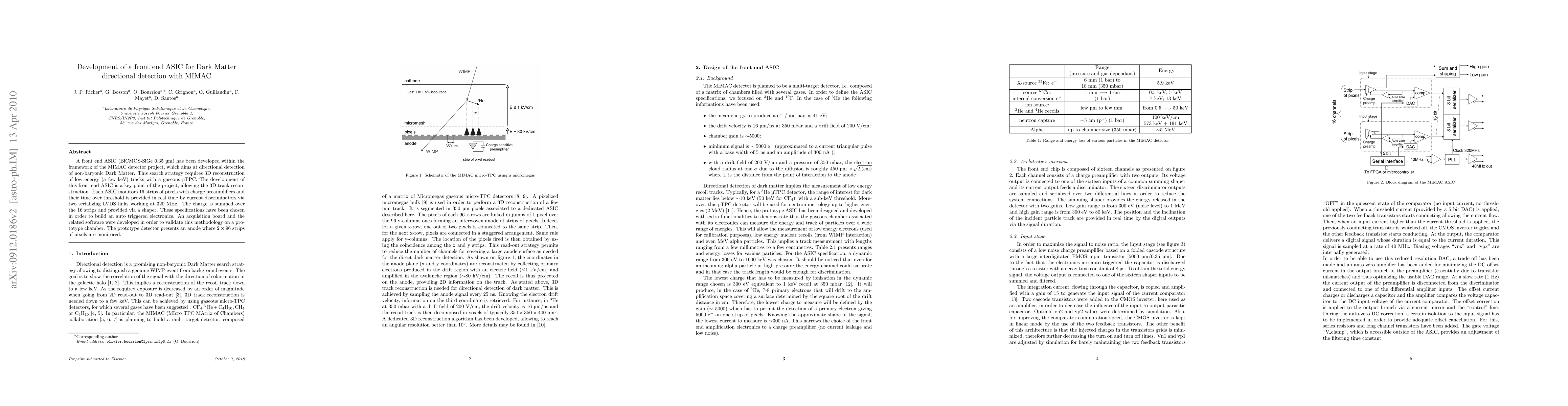 This paper details the development of a front end ASIC for the MIMAC project, which aims to detect non-baryonic Dark Matter directionally. The ASIC, built in BiCMOS-SiGe technology, enables 3D reconstruction of low-energy tracks using a gaseous μTPC, with each ASIC monitoring 16 strips of pixels and transmitting data via LVDS links.