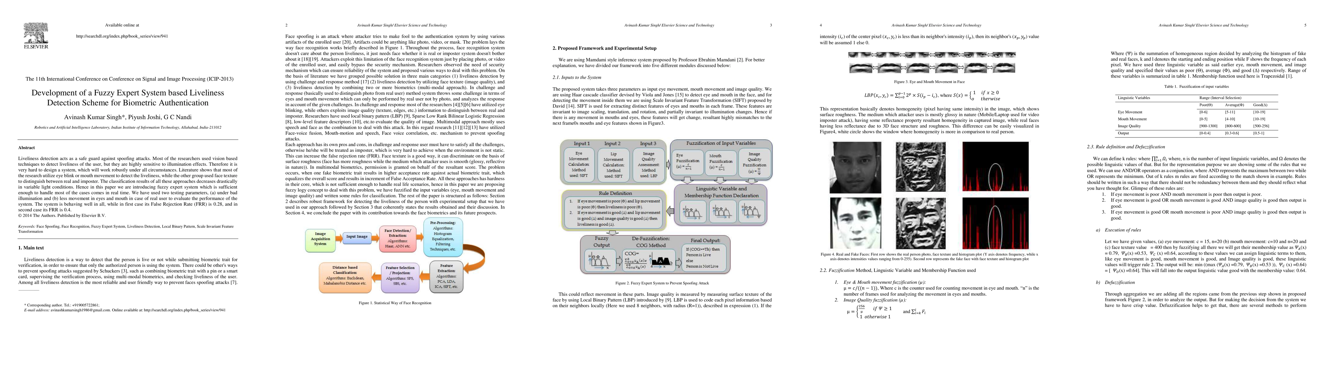 Liveliness detection acts as a safe guard against spoofing attacks. Most of the researchers used vision based techniques to detect liveliness of the user, but they are highly sensitive to illumination effects. Therefore it is very hard to design a system, which will work robustly under all circumstances. Literature shows that most of the research utilize eye blink or mouth movement to detect the liveliness, while the other group used face texture to distinguish between real and imposter. The classification results of all these approaches decreases drastically in variable light conditions. Hence in this paper we are introducing fuzzy expert system which is sufficient enough to handle most of the cases comes in real time. We have used two testing parameters, (a) under bad illumination and (b) less movement in eyes and mouth in case of real user to evaluate the performance of the system. The system is behaving well in all, while in first case its False Rejection Rate (FRR) is 0.28, and in second case its FRR is 0.4.