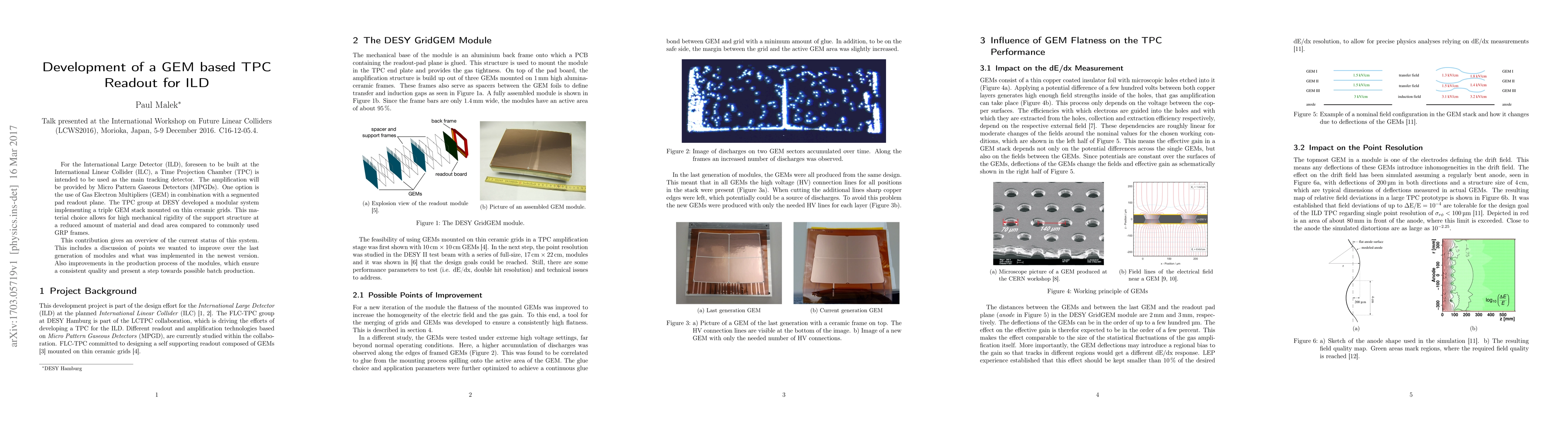 This paper presents the development of a GEM-based TPC readout system for the ILD detector at the ILC, focusing on a modular triple GEM stack with thin ceramic grids for mechanical rigidity and reduced material dead area. The latest improvements include enhanced module production processes ensuring consistent quality and potential batch production.