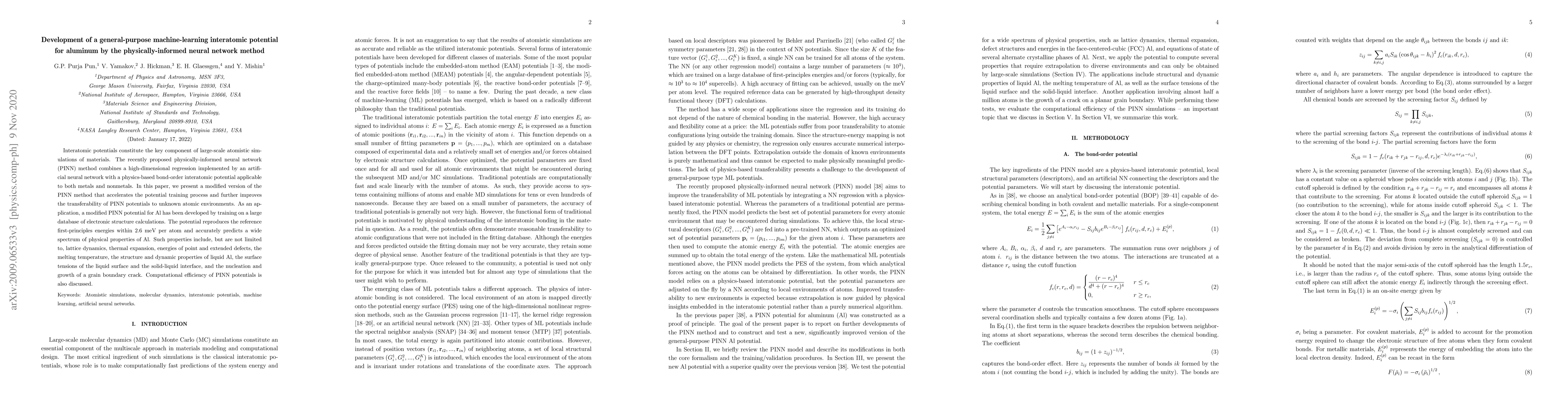 Abstract Interatomic potentials constitute the key component of large-scale atomistic simulations of materials. The recently proposed physically-informed neural network (PINN) method combines a high-dimensional regression implemented by an artificial neural network with a physics-based bond-order interatomic potential applicable to both metals and nonmetals. In this paper, we present a modified version of the PINN method that accelerates the potential training process and further improves the transferability of PINN potentials to unknown atomic environments. As an application, a modified PINN potential for Al has been developed by training on a large database of electronic structure calculations. The potential reproduces the reference first-principles energies within 2.6 meV per atom and accurately predicts a wide spectrum of physical properties of Al. Such properties include, but are not limited to, lattice dynamics, thermal expansion, energies of point and extended defects, the melting temperature, the structure and dynamic properties of liquid Al, the surface tensions of the liquid surface and the solid-liquid interface, and the nucleation and growth of a grain boundary crack. Computational efficiency of PINN potentials is also discussed.