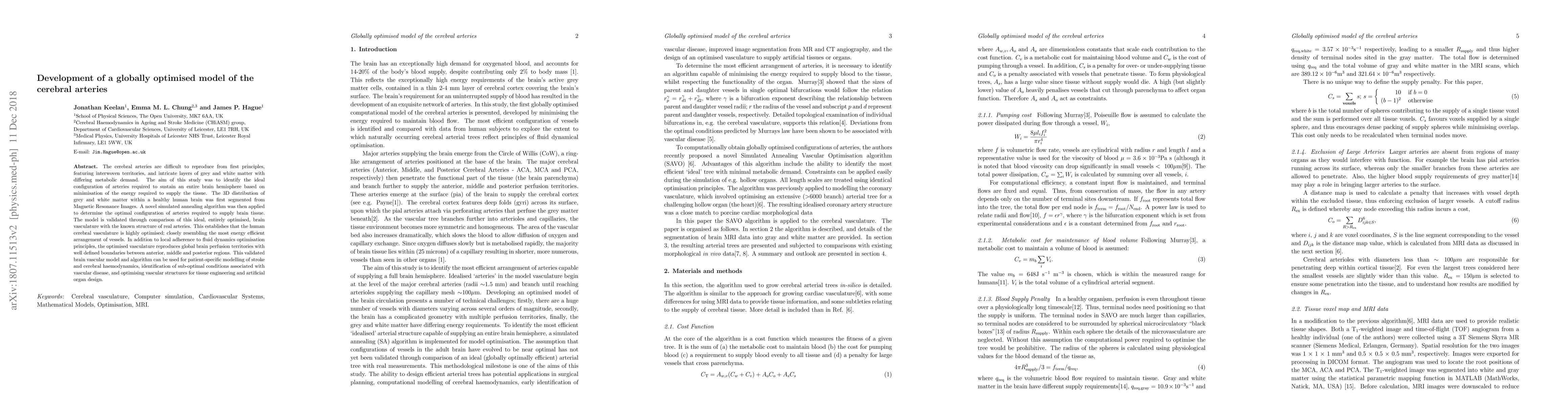 This study develops a globally optimised model of cerebral arteries using a simulated annealing algorithm to minimize energy supply to brain tissue, validated against real arterial structures. The model accurately reproduces global brain perfusion territories and can aid in stroke modelling, vascular disease identification, and tissue engineering.