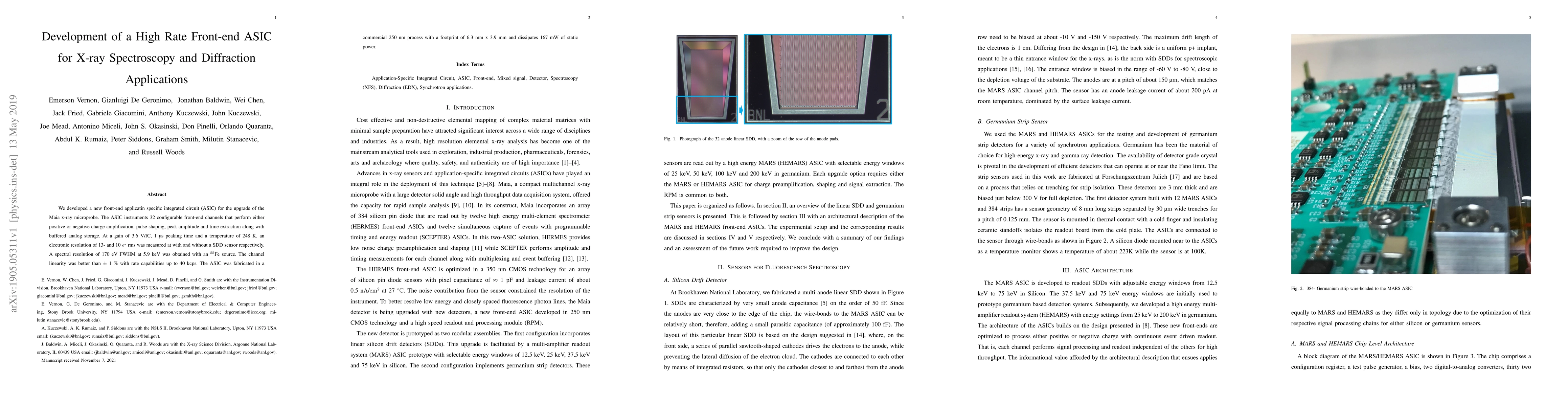 A new ASIC for X-ray spectroscopy and diffraction has been developed, featuring 32 configurable channels with high electronic resolution (13 and 10 electrons rms) and spectral resolution (170 eV FWHM at 5.9 keV). The ASIC, fabricated in a 250 nm commercial process, offers rate capabilities up to 40 kcps, linearity better than ±1%, and a compact 6.3 mm x 3.9 mm footprint with 167 mW power dissipation.