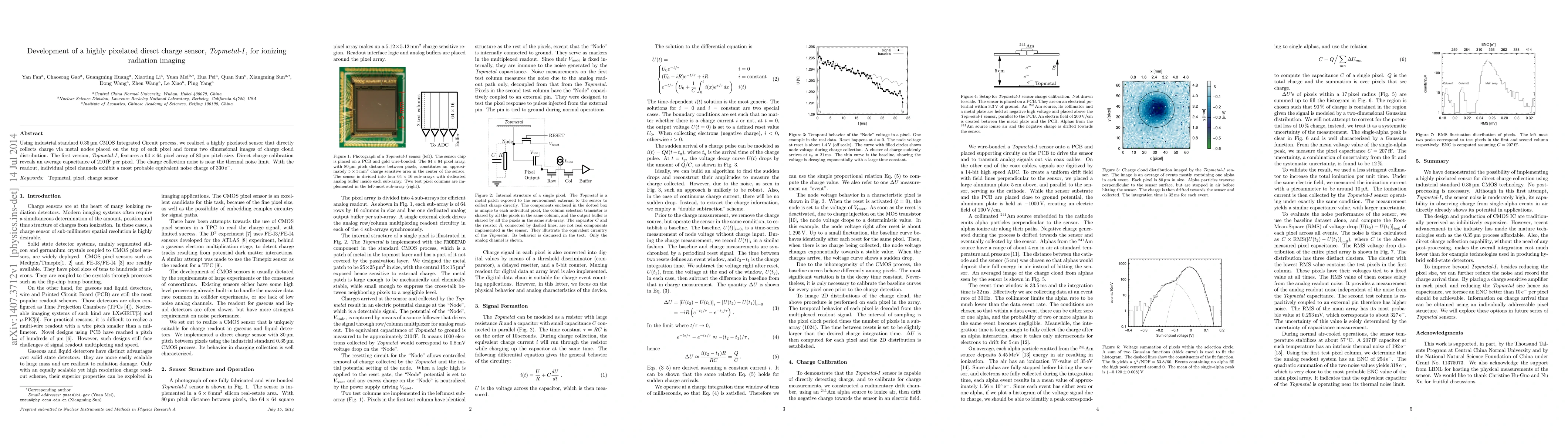 The paper describes the development of a highly pixelated Topmetal-I charge sensor using a 0.35μm CMOS process, which directly collects charge via metal nodes for ionizing radiation imaging. The sensor features a 64x64 pixel array with 80μm pitch, achieving near thermal noise limit charge collection noise.