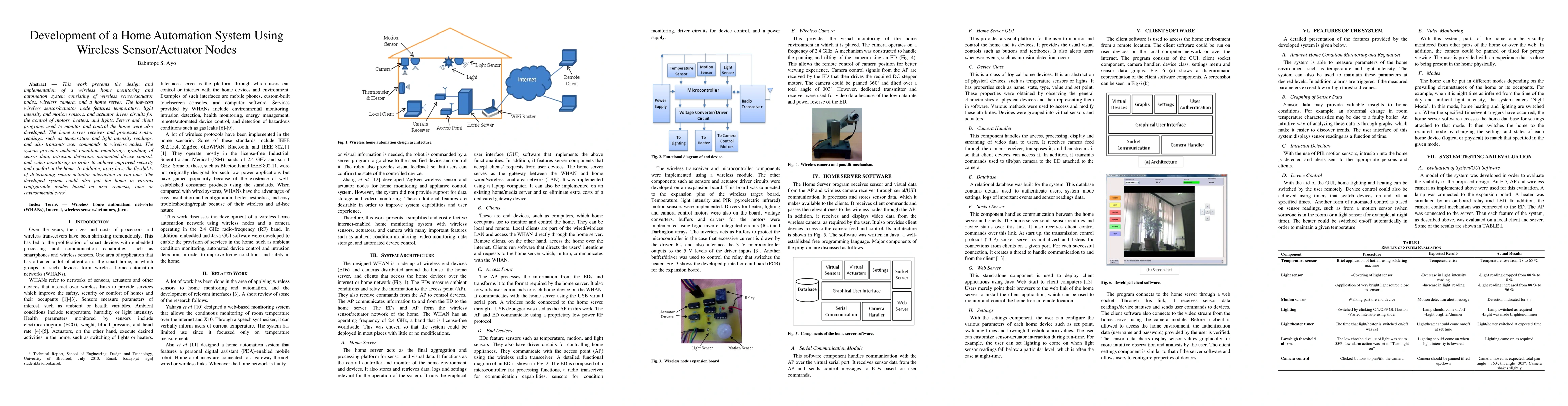 This paper details the creation of a cost-effective wireless home automation system using sensor/actuator nodes, a wireless camera, and a home server for monitoring and control. The system enables ambient condition monitoring, automated device control, and video surveillance for enhanced home security and comfort.