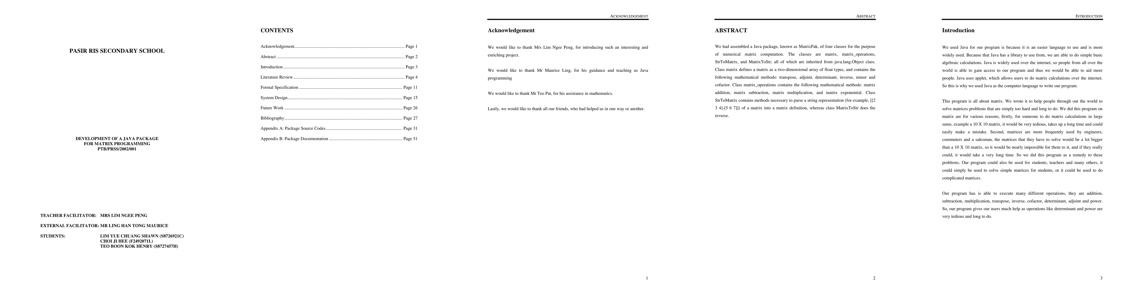 We had assembled a Java package, known as MatrixPak, of four classes for the purpose of numerical matrix computation. The classes are matrix, matrix_operations, StrToMatrix, and MatrixToStr; all of which are inherited from java.lang.Object class. Class matrix defines a matrix as a two-dimensional array of float types, and contains the following mathematical methods: transpose, adjoint, determinant, inverse, minor and cofactor. Class matrix_operations contains the following mathematical methods: matrix addition, matrix subtraction, matrix multiplication, and matrix exponential. Class StrToMatrix contains methods necessary to parse a string representation (for example, [[2 3 4]-[5 6 7]]) of a matrix into a matrix definition, whereas class MatrixToStr does the reverse.