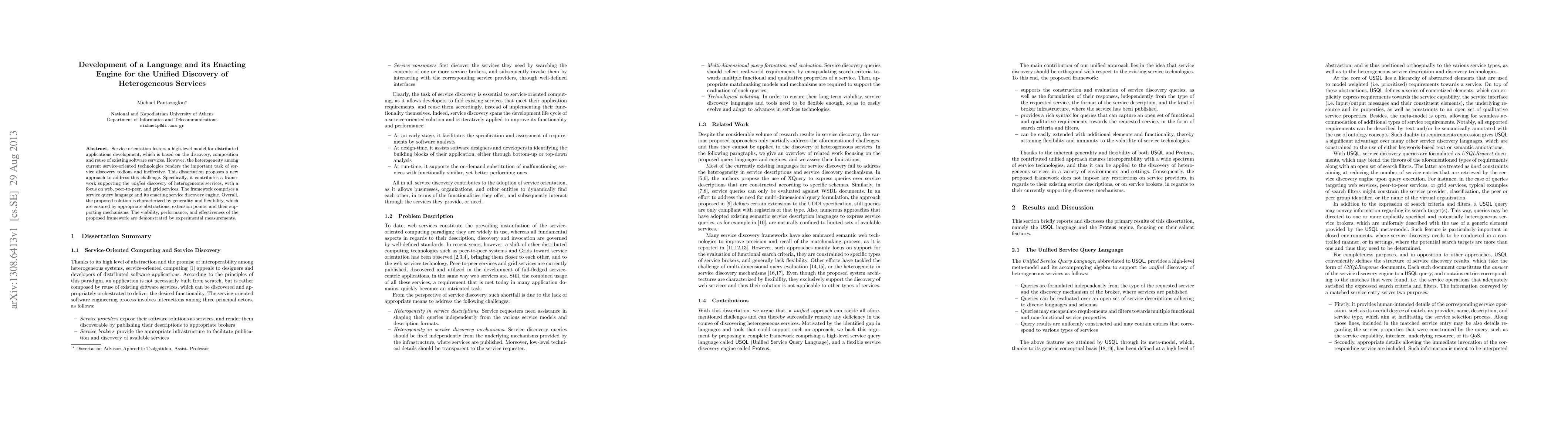 Service orientation fosters a high-level model for distributed applications development, which is based on the discovery, composition and reuse of existing software services. However, the heterogeneity among current service-oriented technologies renders the important task of service discovery tedious and ineffective. This dissertation proposes a new approach to address this challenge. Specifically, it contributes a framework supporting the unified discovery of heterogeneous services, with a focus on web, peer-to-peer, and grid services. The framework comprises a service query language and its enacting service discovery engine. Overall, the proposed solution is characterized by generality and flexibility, which are ensured by appropriate abstractions, extension points, and their sup- porting mechanisms. The viability, performance, and effectiveness of the proposed framework are demonstrated by experimental measurements.