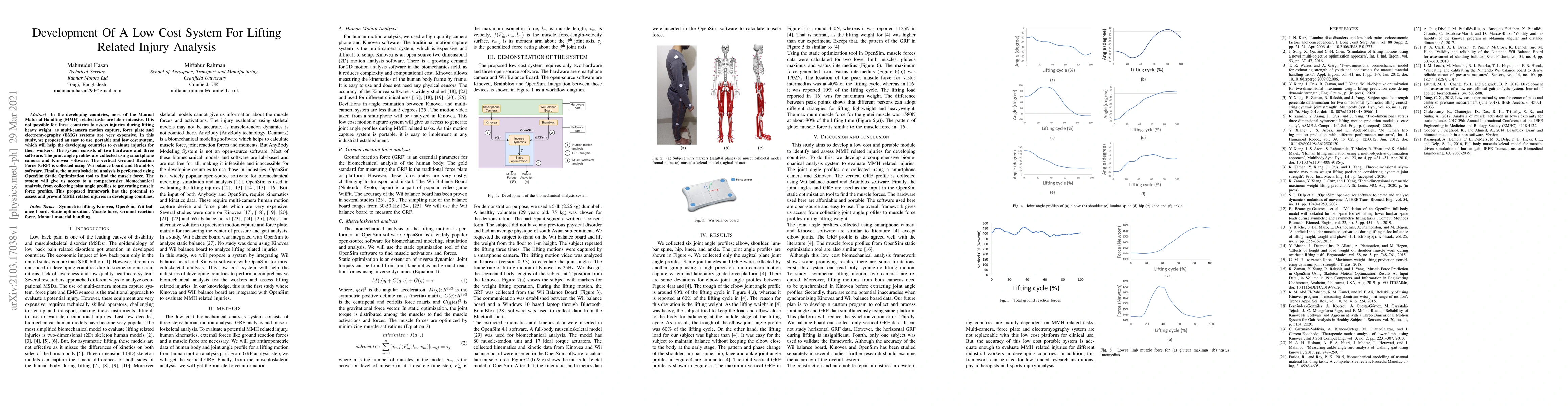 This study proposes a low-cost, portable system for analyzing lifting-related injuries in developing countries using smartphone and Wii balance board technologies. The system enables comprehensive biomechanical analysis through joint angle and force data collection, aiming to assess and prevent Manual Material Handling injuries.