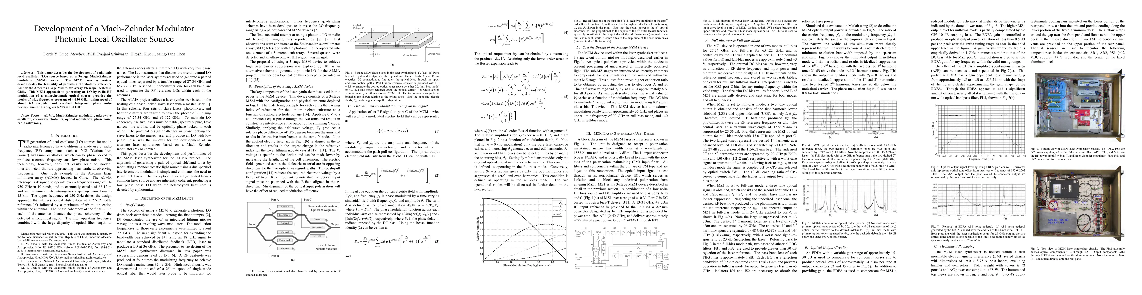 This paper describes the development of a photonic local oscillator (LO) source based on a 3-stage Mach-Zehnder modulator (MZM) device. The MZM laser synthesizer demonstrates the feasibility of providing the photonic reference LO for the Atacama Large Millimeter Array telescope located in Chile. This MZM approach to generating an LO by radio RF modulation of a monochromatic optical source provides the merits of wide frequency coverage of 4-130 GHz, tuning speed of about 0.2 seconds, and residual integrated phase noise performance of 0.3 degrees RMS at 100 GHz.