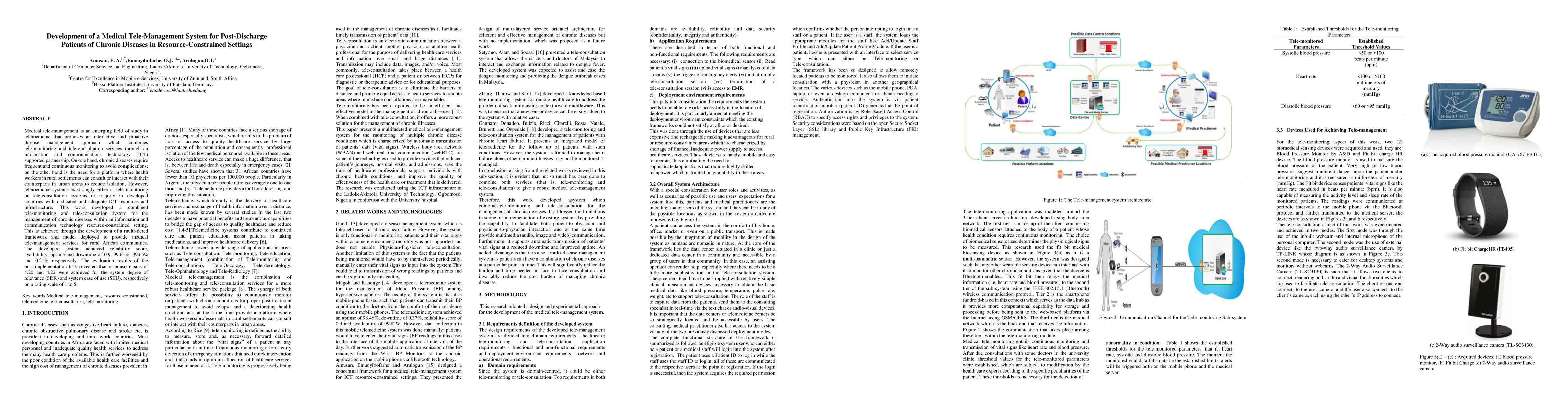 This paper develops a combined tele-monitoring and tele-consultation system for managing chronic diseases in rural African settings with limited ICT resources. The system achieved high reliability and user satisfaction, demonstrating its potential to bridge healthcare gaps in resource-constrained environments.