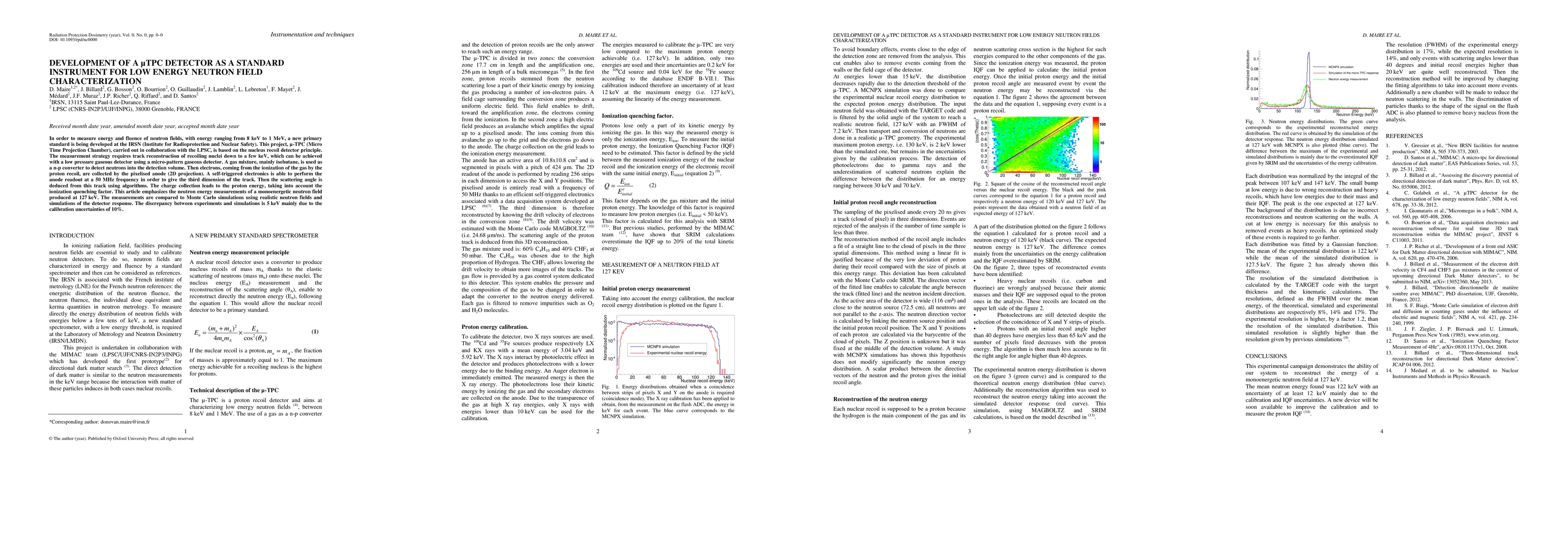 This paper details the development of a micro-TPC detector for characterizing low-energy neutron fields, utilizing a nucleus recoil detector principle. The detector employs a low-pressure gaseous medium with a micro-pattern gaseous detector for track reconstruction, achieving measurements in the 8 keV to 1 MeV range, with a focus on neutron energy measurements at 127 keV, showing a 5 keV discrepancy due to calibration uncertainties.