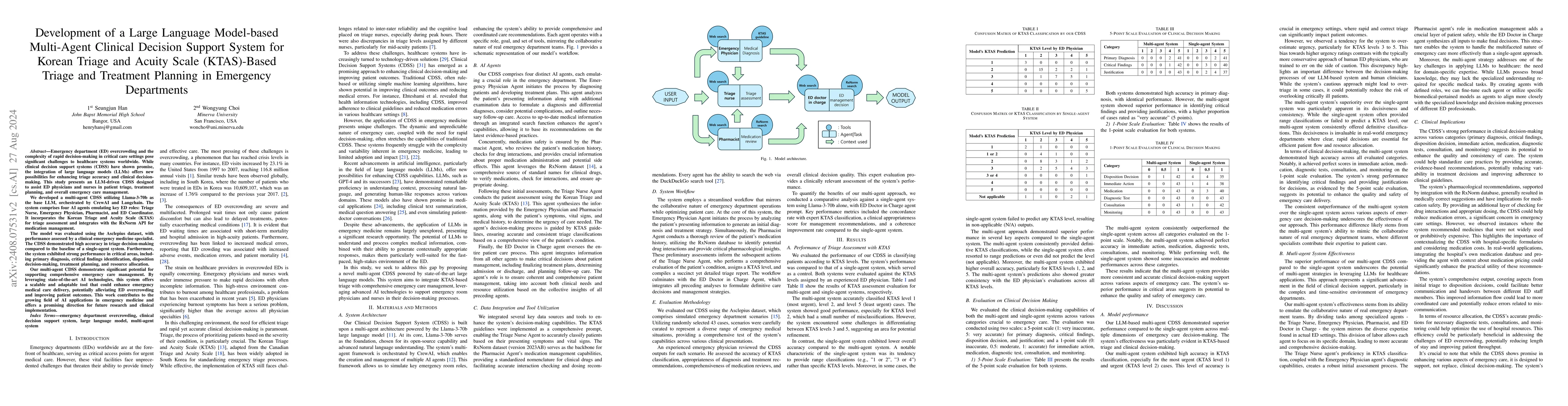 This study developed a multi-agent clinical decision support system powered by an LLM to enhance emergency care management in Korean emergency departments using the KTAS scale, showing improved triage and treatment planning accuracy over single-agent systems. The system, comprising specialized AI agents, integrates with medical databases for better decision support.