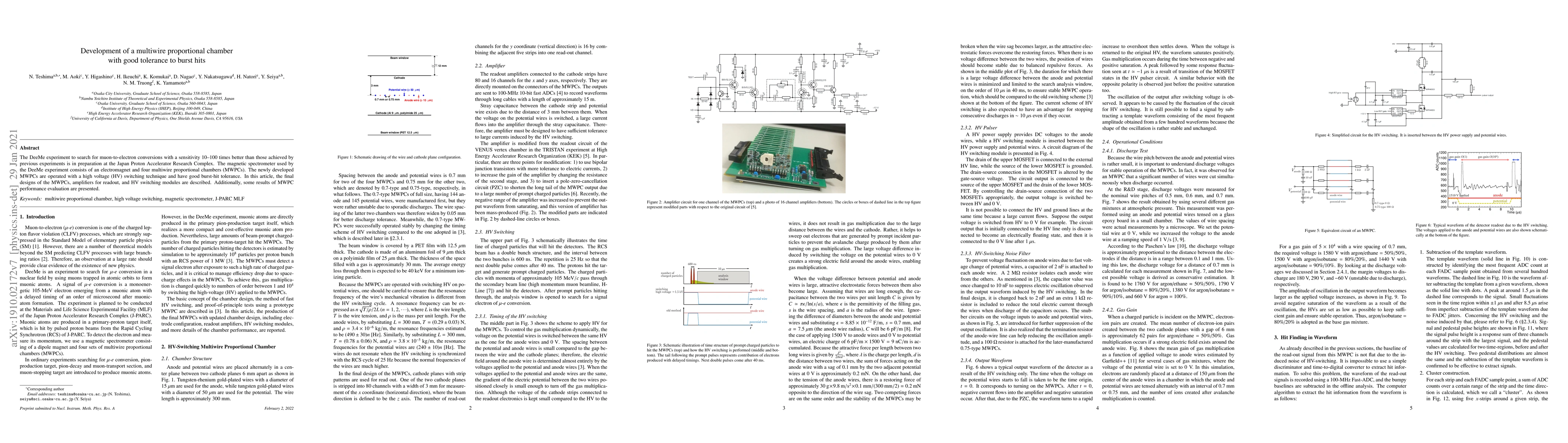 The DeeMe experiment aims to detect muon-to-electron conversions with enhanced sensitivity. The developed multiwire proportional chambers (MWPCs) utilize a high voltage switching technique and exhibit good tolerance to burst hits, crucial for the experiment's success. Performance evaluations of the MWPCs are also presented.