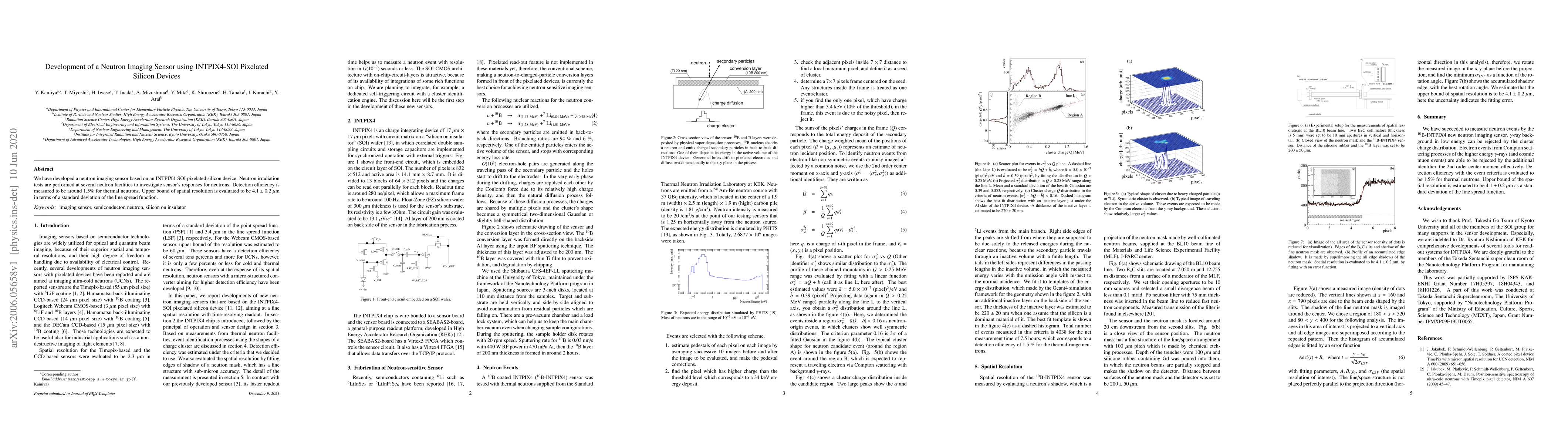 We have developed a neutron imaging sensor based on an INTPIX4-SOI pixelated silicon device. Neutron irradiation tests are performed at several neutron facilities to investigate sensor's responses for neutrons. Detection efficiency is measured to be around $1.5$\% for thermal neutrons. Upper bound of spatial resolution is evaluated to be $4.1 \pm 0.2 ~\mu$m in terms of a standard deviation of the line spread function.