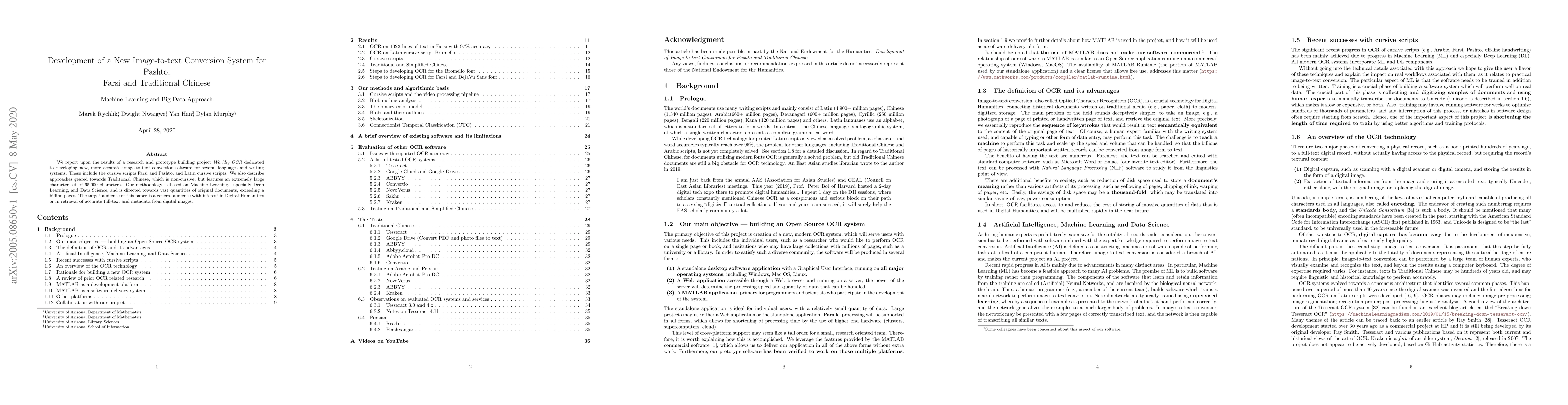 This paper details the development of the Worldly OCR system, a new image-to-text conversion software using Deep Learning for accurate transcription of Farsi, Pashto, and Traditional Chinese scripts. The project aims to handle vast quantities of original documents, focusing on improving text retrieval in Digital Humanities.