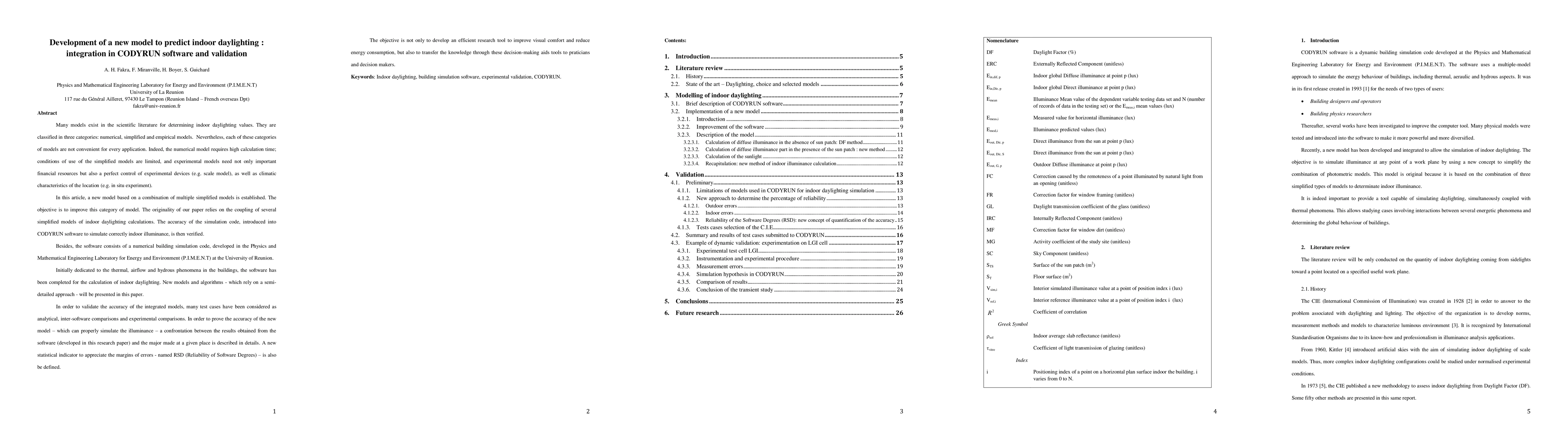 Many models exist in the scientific literature for determining indoor daylighting values. They are classified in three categories: numerical, simplified and empirical models. Nevertheless, each of these categories of models are not convenient for every application. Indeed, the numerical model requires high calculation time; conditions of use of the simplified models are limited, and experimental models need not only important financial resources but also a perfect control of experimental devices (e.g. scale model), as well as climatic characteristics of the location (e.g. in situ experiment). In this article, a new model based on a combination of multiple simplified models is established. The objective is to improve this category of model. The originality of our paper relies on the coupling of several simplified models of indoor daylighting calculations. The accuracy of the simulation code, introduced into CODYRUN software to simulate correctly indoor illuminance, is then verified. Besides, the software consists of a numerical building simulation code, developed in the Physics and Mathematical Engineering Laboratory for Energy and Environment (P.I.M.E.N.T) at the University of Reunion. Initially dedicated to the thermal, airflow and hydrous phenomena in the buildings, the software has been completed for the calculation of indoor daylighting. New models and algorithms - which rely on a semi-detailed approach - will be presented in this paper. In order to validate the accuracy of the integrated models, many test cases have been considered as analytical, inter-software comparisons and experimental comparisons. In order to prove the accuracy of the new model - which can properly simulate the illuminance - a confrontation between the results obtained from the software (developed in this research paper) and the major made at a given place is described in details. A new statistical indicator to appreciate the margins of errors - named RSD (Reliability of Software Degrees) - is also be defined.