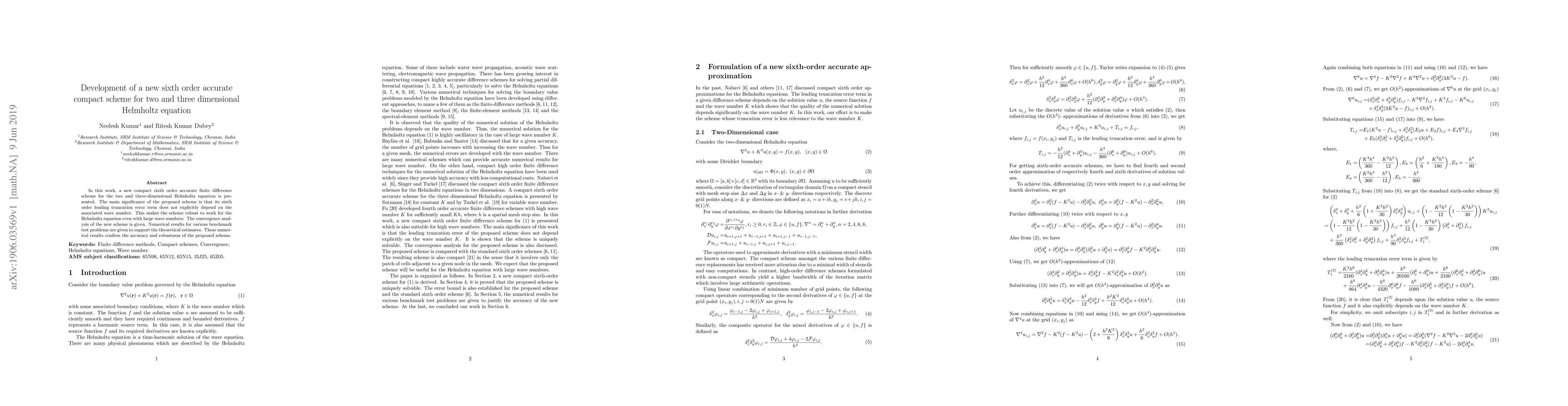 This paper introduces a new sixth-order accurate compact finite difference scheme for solving the two and three-dimensional Helmholtz equation, which maintains accuracy regardless of large wave numbers due to its wave number independent truncation error. Numerical tests validate the theoretical convergence and accuracy of the proposed scheme.