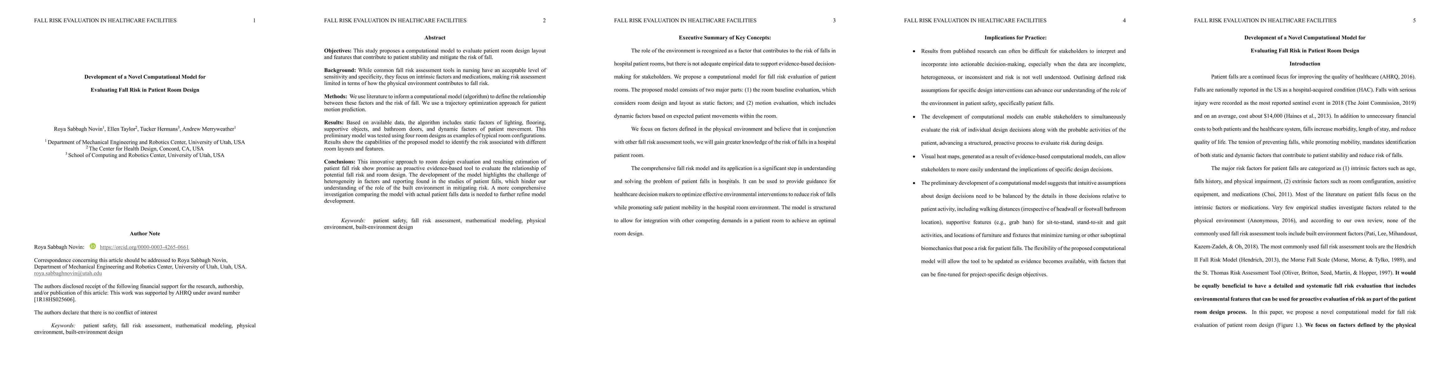 This study develops a novel computational model to evaluate fall risk in hospital patient room designs by considering physical environment and patient motion factors, demonstrating its potential to identify risky locations. However, further research is needed to validate the model's factors and improve its reliability for practical application in healthcare settings.