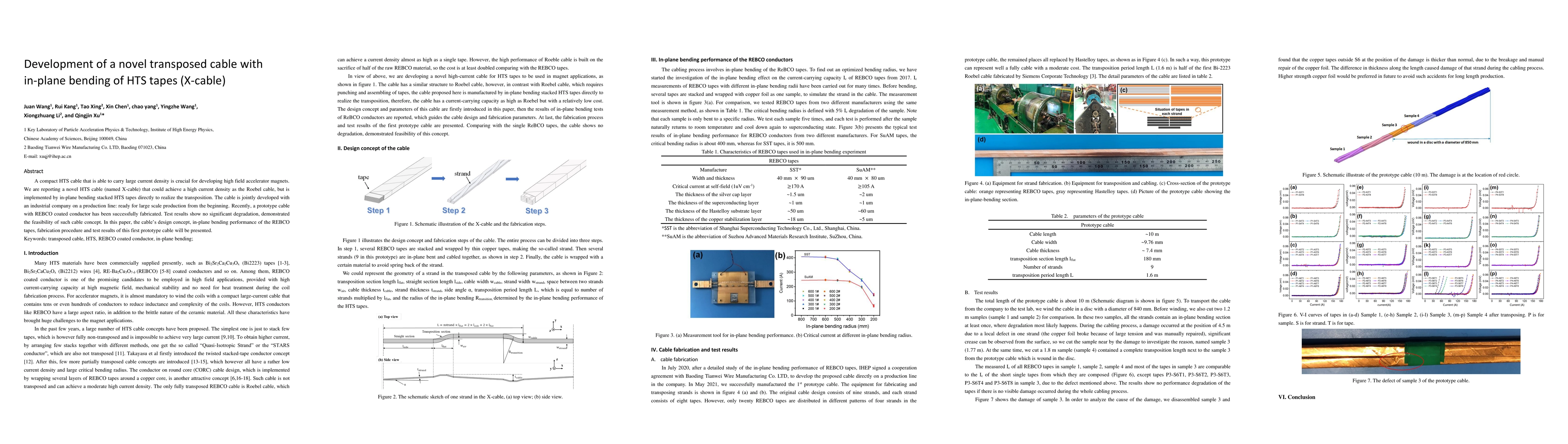 This paper introduces a novel X-cable design for high-temperature superconducting (HTS) cables that utilizes in-plane bending of stacked HTS tapes for high current density, comparable to Roebel cables, and demonstrates successful fabrication and performance of a prototype cable.