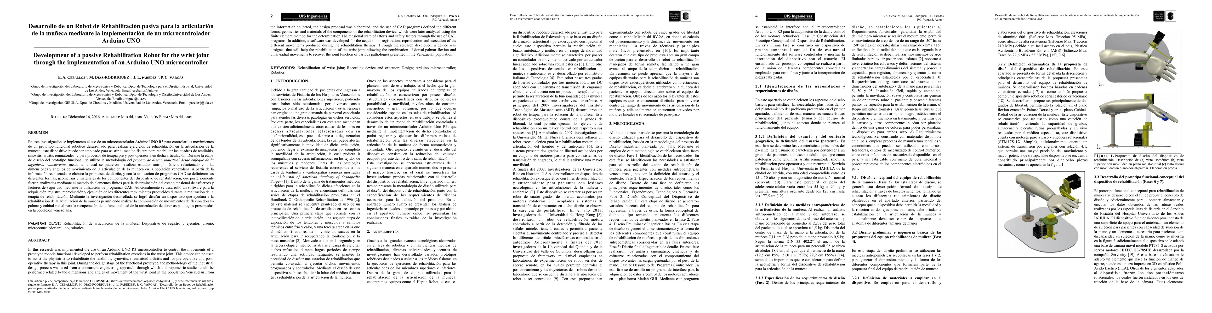 In this research was implemented the use of an Arduino UNO R3 microcontroller to control the movements of a prototype robotic functional developed to perform rehabilitation exercises in the wrist joint; This device can be used to assist the physiatrist to rehabilitate the tendinitis, synovitis, rheumatoid arthritis and for pre-operative and post-operative therapy in this joint. During the design stage of the functional prototype, the methodology of the industrial design process was used from a concurrent engineering approach, through which anthropometric studies could be performed related to the dimensions and angles of movement of the wrist joint in the population Venezuelan from the information collected, the design proposal was elaborated, and the use of CAD programs defined the different forms, geometries and materials of the components of the rehabilitation device, which were later analyzed using the finite element method for the determination The tensional state of efforts and safety factors through the use of CAE programs. In addition, a software was developed for the acquisition, registration, reproduction and execution of the different movements produced during the rehabilitation therapy. Through the research developed, a device was designed that will help the rehabilitation of the wrist joint allowing the combination of dorsal-palmar flexion and ulnar-radial movements to recover the joint function of various pathologies presented in the Venezuelan population.