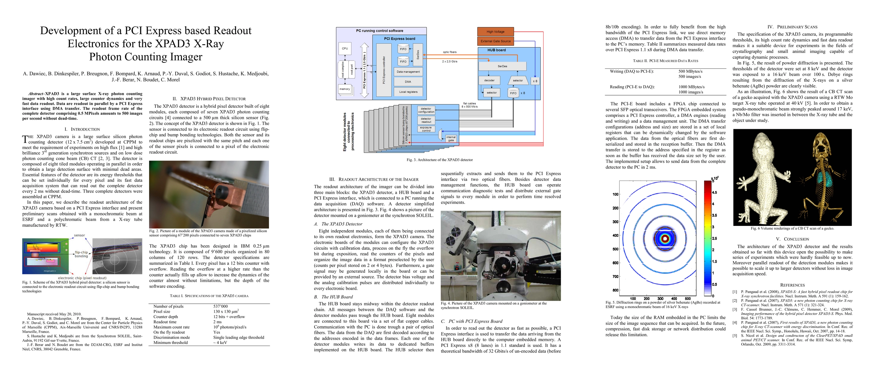 XPAD3 is a large surface X-ray photon counting imager with high count rates, large counter dynamics and very fast data readout. Data are readout in parallel by a PCI Express interface using DMA transfer. The readout frame rate of the complete detector comprising 0.5 MPixels amounts to 500 images per second without dead-time.