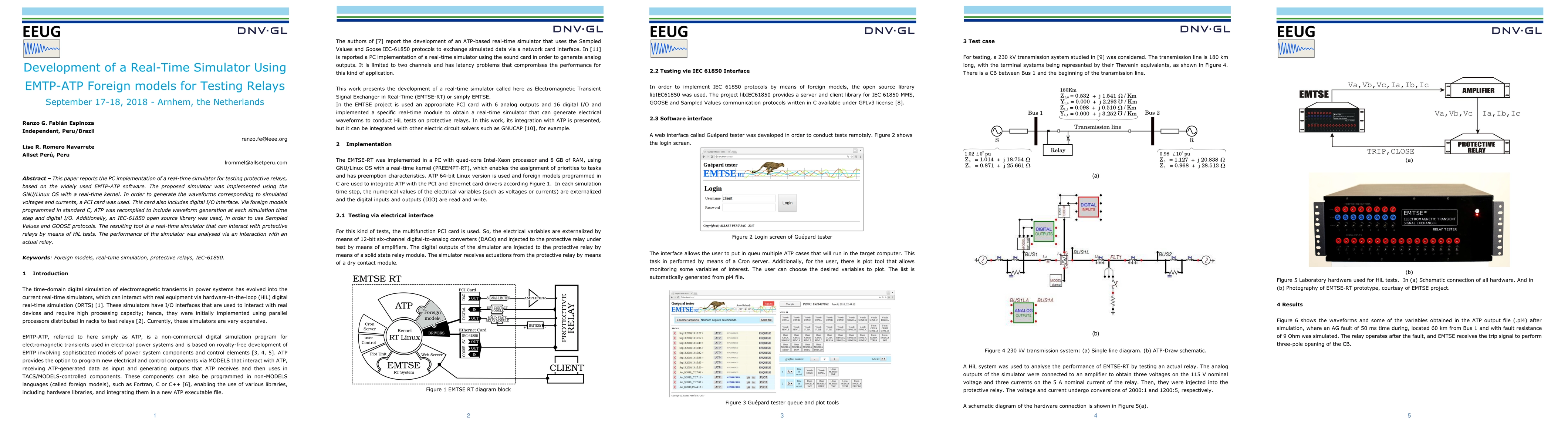 The development of EMTSE-RT, a real-time simulator using EMTP-ATP foreign models and a PCI card for waveform generation and digital I/O, along with an IEC-61850 open-source library.