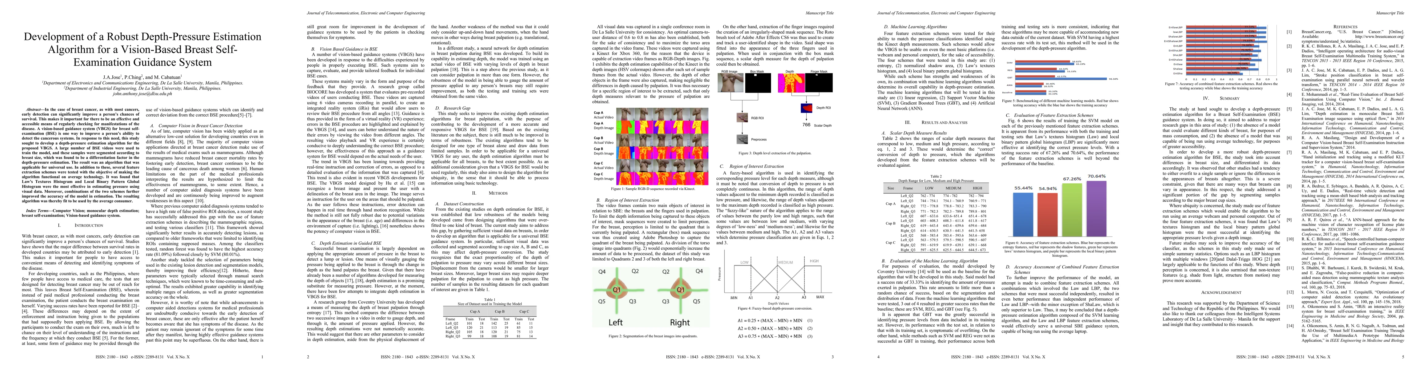 In the case of breast cancer, as with most cancers, early detection can significantly improve a person's chances of survival. This makes it important for there to be an effective and accessible means of regularly checking for manifestations of the disease. A vision-based guidance system (VBGS) for breast self-examination (BSE) is one way to improve a person's ability to detect the cancerous systems. In response to this need, this study sought to develop a depth-pressure estimation algorithm for the proposed VBGS. A large number of BSE videos were used to train the model, and these samples were segmented according to breast size, which was found to be a differentiation factor in the depth-pressure estimation. The result was an algorithm that was applicable for universal use. In addition to these, several feature extraction schemes were tested with the objective of making the algorithm functional on average technology. It was found that Law's Textures Histogram and Local Binary Pattern Global Histogram were the most effective in estimating pressure using visual data. Moreover, combinations of the two schemes further improved the accuracy of the model in estimation. The resulting algorithm was thereby fit to be used by the average consumer.
