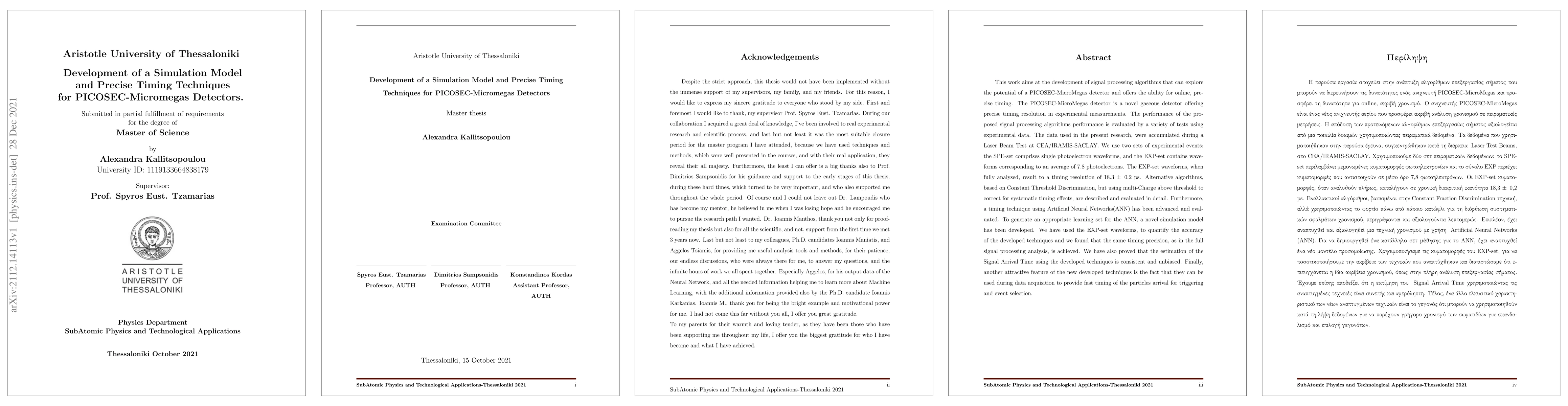 This paper develops signal processing algorithms for PICOSEC-MicroMegas detectors, achieving precise timing resolution of 18.3 ± 0.2 ps. Techniques include Constant Threshold Discrimination and Artificial Neural Networks, validated with experimental data from CEA/IRAMIS-SACLAY.