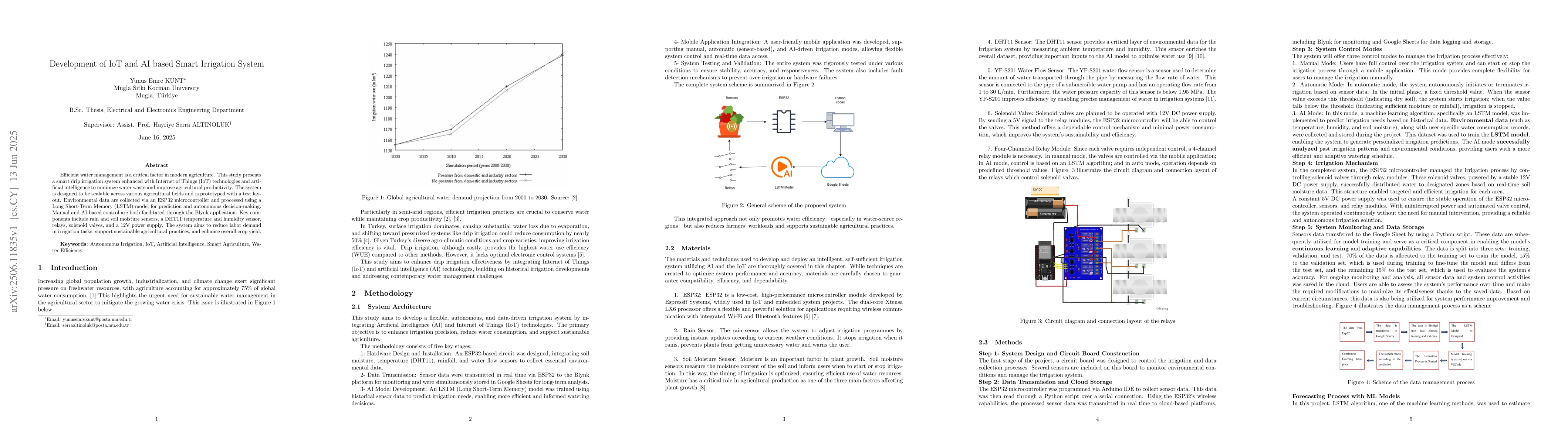 Agricultural irrigation ensures that the water required for plant growth is delivered to the soil in a controlled manner. However, uncontrolled management can lead to water waste while reducing agricultural productivity. Drip irrigation systems, which have been one of the most efficient methods since the 1970s, are modernised with IoT and artificial intelligence in this study, aiming to both increase efficiency and prevent water waste. The developed system is designed to be applicable to different agricultural production areas and tested with a prototype consisting of 3 rows and 3 columns. The project will commence with the transmission of environmental data from the ESP32 microcontroller to a computer via USB connection, where it will be processed using an LSTM model to perform learning and prediction. The user will be able to control the system manually or delegate it to artificial intelligence through the Blynk application. The system includes ESP32 microcontroller, rain and soil moisture sensors, DHT11 temperature and humidity sensor, relays, solenoid valves and 12V power supply. The system aims to increase labour productivity and contribute to the conservation of water resources by enabling agricultural and greenhouse workers to focus on processes other than irrigation. In addition, the developed autonomous irrigation system will support the spread of sustainable agricultural practices and increase agricultural productivity. Keywords: Autonomous Irrigation, IoT, Artificial Intelligence, Agriculture, Water Management