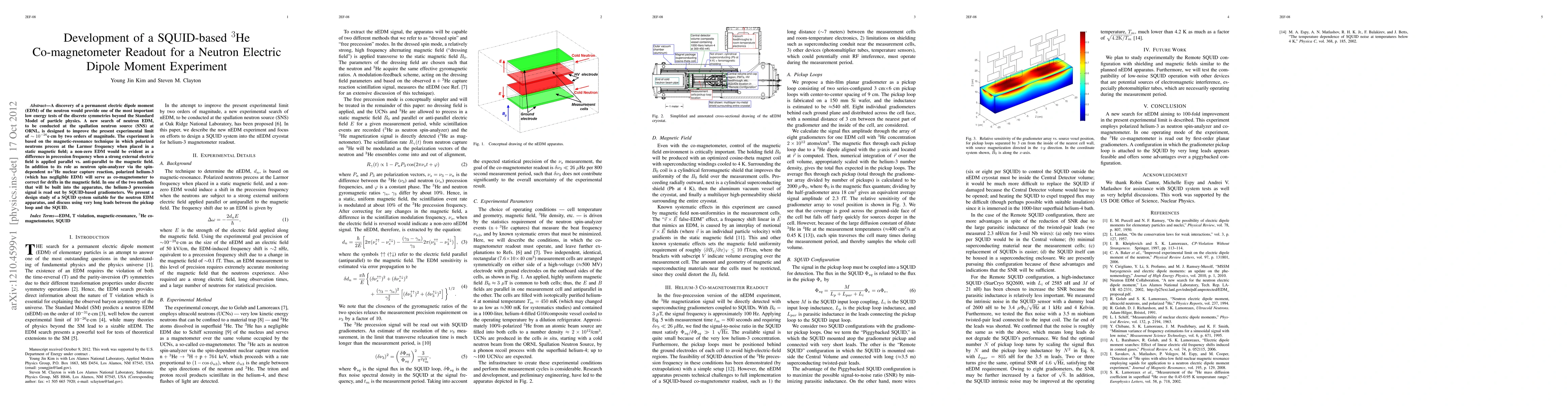 This paper details the development of a SQUID-based 3He co-magnetometer for a neutron electric dipole moment experiment at the SNS, aiming to improve the current experimental limit by two orders of magnitude. The co-magnetometer, utilizing polarized helium-3, will correct for magnetic field drifts, with the helium-3 precession signal read out by SQUID-based gradiometers.