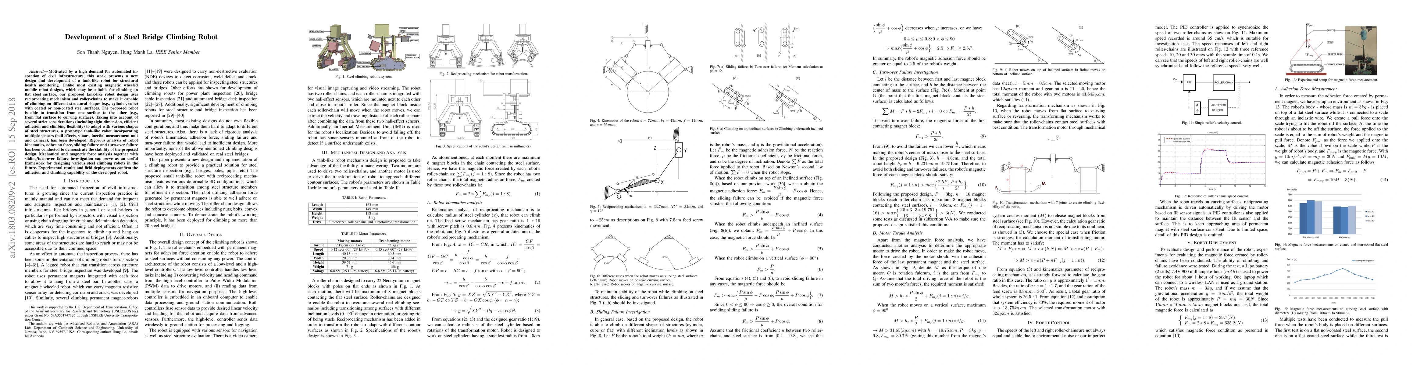Motivated by a high demand for automated inspection of civil infrastructure, this work presents a new design and development of a tank-like robot for structural health monitoring. Unlike most existing magnetic wheeled mobile robot designs, which may be suitable for climbing on flat steel surface, our proposed tank-like robot design uses reciprocating mechanism and roller-chains to make it capable of climbing on different structural shapes (e.g., cylinder, cube) with coated or non-coated steel surfaces. The proposed robot is able to transition from one surface to the other (e.g., from flat surface to curving surface). Taking into account of several strict considerations (including tight dimension, efficient adhesion and climbing flexibility) to adapt with various shapes of steel structures, a prototype tank-like robot incorporating multiple sensors (hall-effects, sonars, inertial measurement unit and camera), has been developed. Rigorous analysis of robot kinematics, adhesion force, sliding failure and turn-over failure has been conducted to demonstrate the stability of the proposed design. Mechanical and magnetic force analysis together with sliding/turn-over failure investigation can serve as an useful framework for designing various steel climbing robots in the future. Experimental results and field deployments confirm the adhesion and climbing capability of the developed robot.