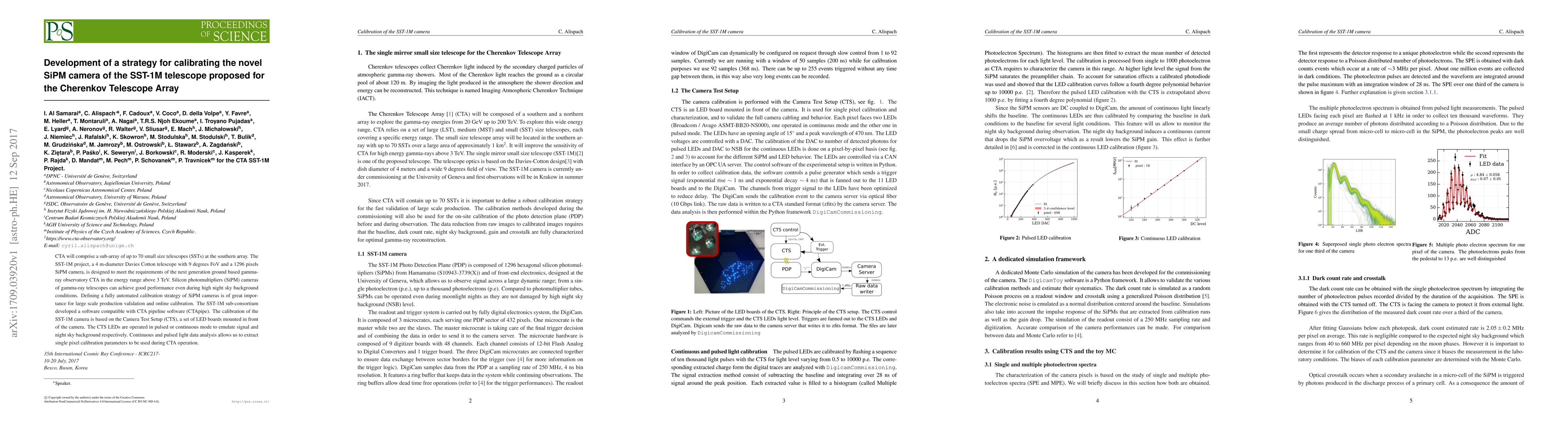 CTA will comprise a sub-array of up to 70 small size telescopes (SSTs) at the southern array. The SST-1M project, a 4 m-diameter Davies Cotton telescope with 9 degrees FoV and a 1296 pixels SiPM camera, is designed to meet the requirements of the next generation ground based gamma-ray observatory CTA in the energy range above 3 TeV. Silicon photomultipliers (SiPM) cameras of gamma-ray telescopes can achieve good performance even during high night sky background conditions. Defining a fully automated calibration strategy of SiPM cameras is of great importance for large scale production validation and online calibration. The SST-1M sub-consortium developed a software compatible with CTA pipeline software (CTApipe). The calibration of the SST-1M camera is based on the Camera Test Setup (CTS), a set of LED boards mounted in front of the camera. The CTS LEDs are operated in pulsed or continuous mode to emulate signal and night sky background respectively. Continuous and pulsed light data analysis allows us to extract single pixel calibration parameters to be used during CTA operation.