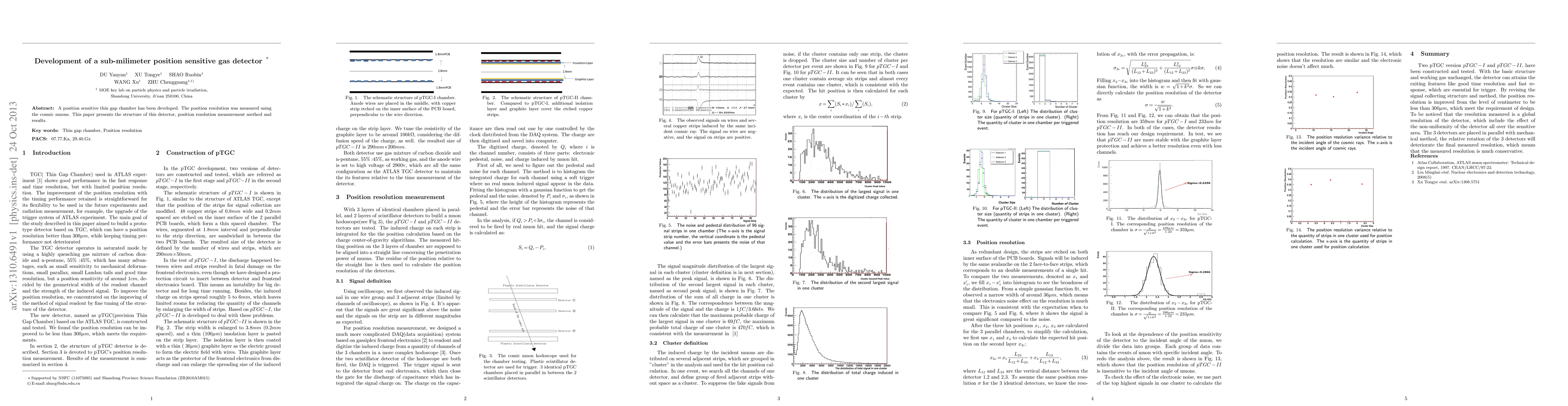 This paper details the development of a sub-millimeter position sensitive thin gap chamber and reports on its structure, the method used to measure its position resolution using cosmic muons, and the achieved resolution results.